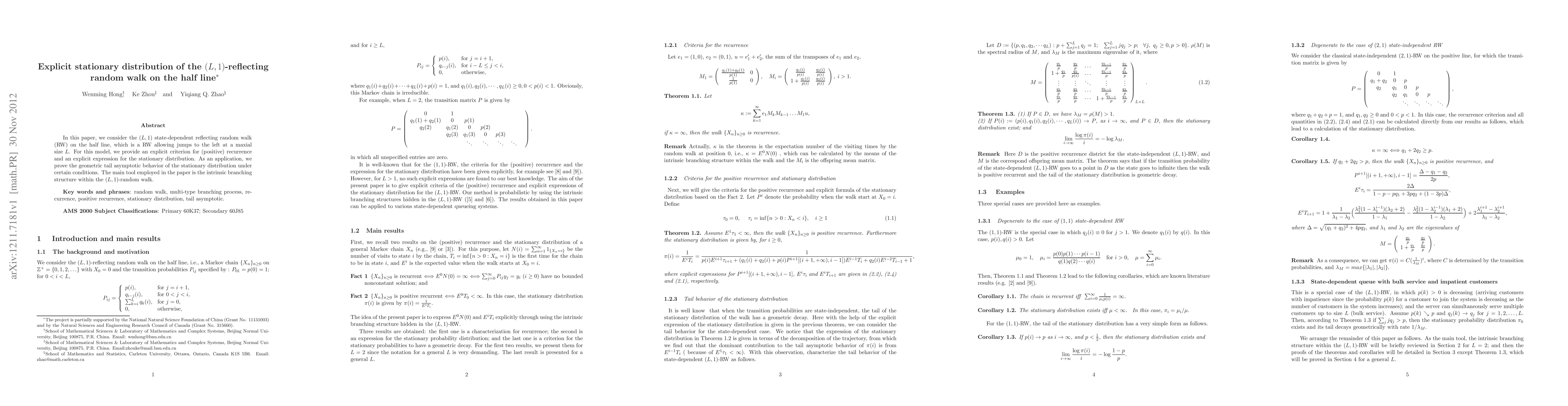 This paper studies the $(L,1)$ state-dependent reflecting random walk on the half line, providing an explicit criterion for its recurrence and an explicit expression for its stationary distribution. The study also proves the geometric tail asymptotic behavior of the stationary distribution under certain conditions, utilizing the intrinsic branching structure of the random walk.