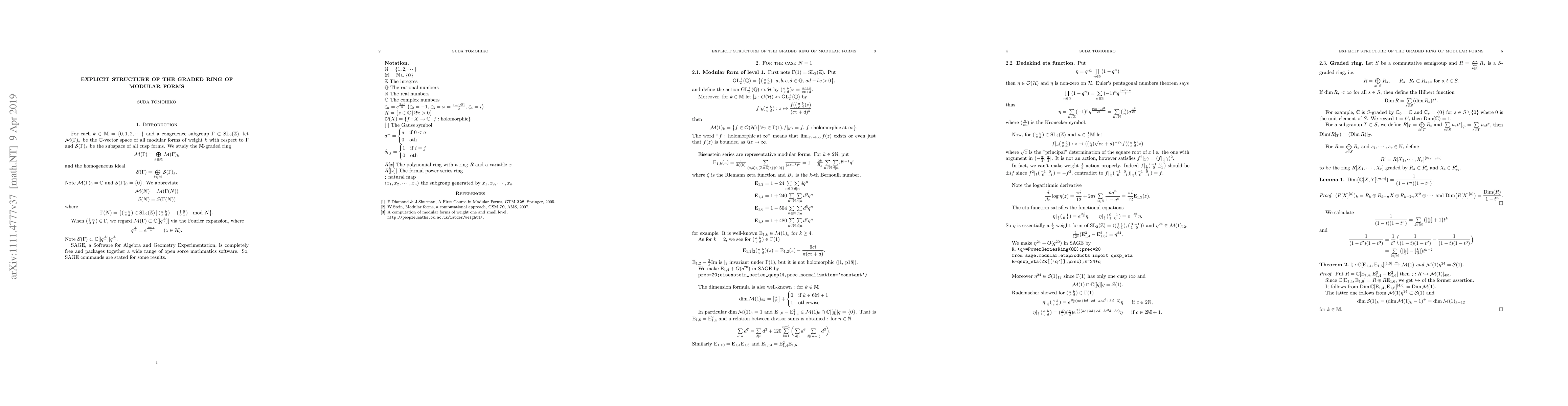 We give explicit structure of the graded ring of modular forms with respect to Gamma(N) (N=1,2,3,4,5,6,7,8,9,10,12,16,18) and for some other congruence groups. We also study the modular forms of half-integer weight for certain groups.