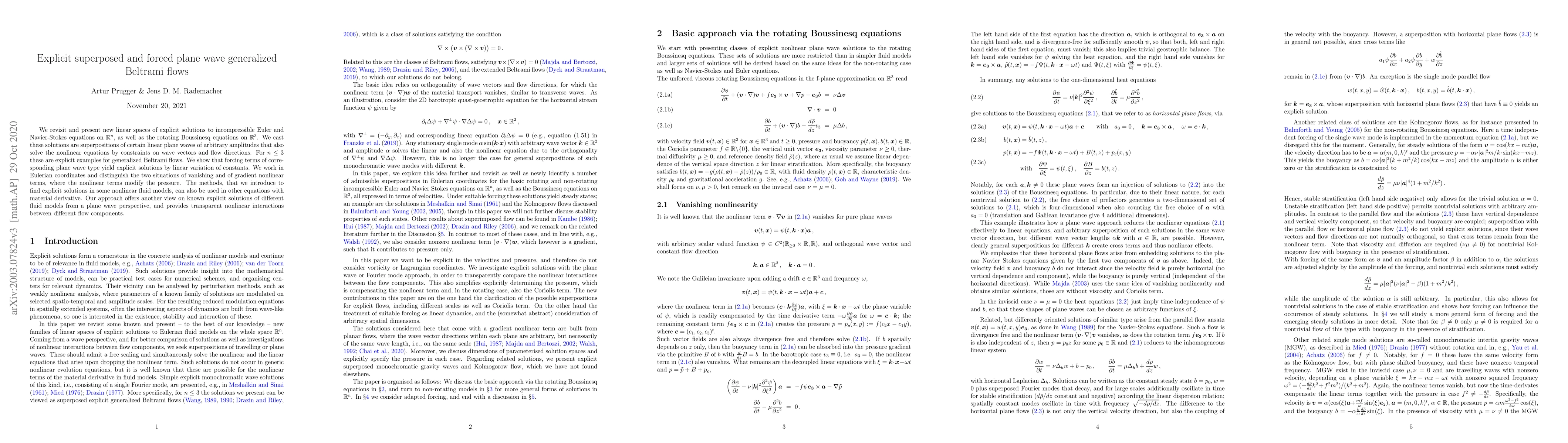 We revisit and present new linear spaces of explicit solutions to incompressible Euler and Navier-Stokes equations on $\mathbb{R}^n$, as well as the rotating Boussinesq equations on $\mathbb{R}^3$. We cast these solutions are superpositions of certain linear plane waves of arbitrary amplitudes that also solve the nonlinear equations by constraints on wave vectors and flow directions. For $n\leq 3$ these are explicit examples for generalized Beltrami flows. We show that forcing terms of corresponding plane wave type yield explicit solutions by linear variation of constants. We work in Eulerian coordinates and distinguish the two situations of vanishing and of gradient nonlinear terms, where the nonlinear terms modify the pressure. The methods, that we introduce to find explicit solutions in some nonlinear fluid models, can also be used in other equations with material derivative. Our approach offers another view on known explicit solutions of different fluid models from a plane wave perspective, and provides transparent nonlinear interactions between different flow components.