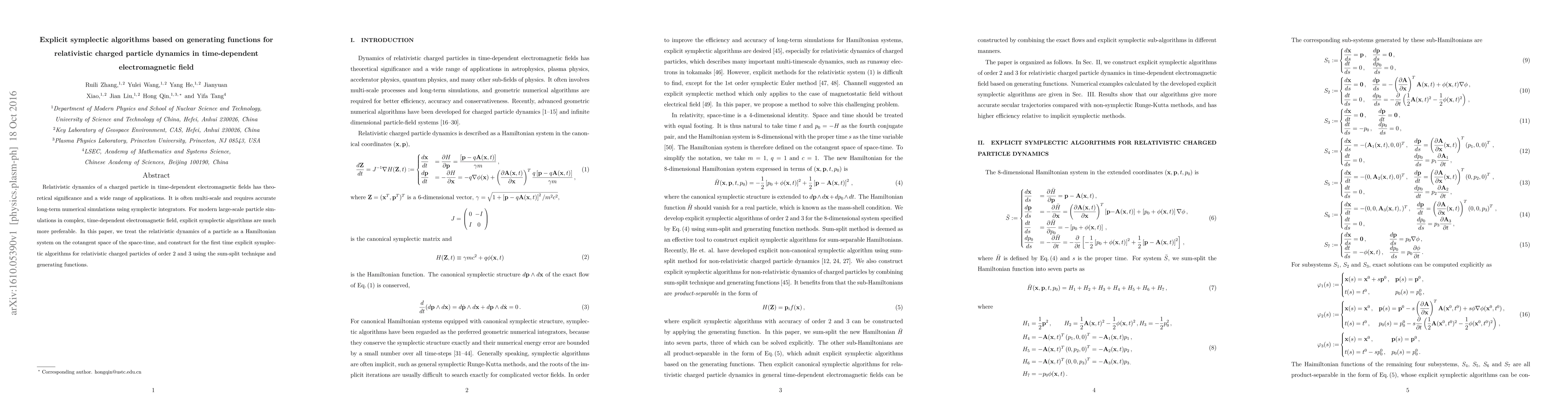 This paper develops explicit symplectic algorithms of orders 2 and 3 for simulating the relativistic dynamics of charged particles in time-dependent electromagnetic fields, utilizing generating functions and the sum-split technique for accurate long-term numerical simulations. These algorithms are preferred for large-scale particle simulations in complex electromagnetic environments.