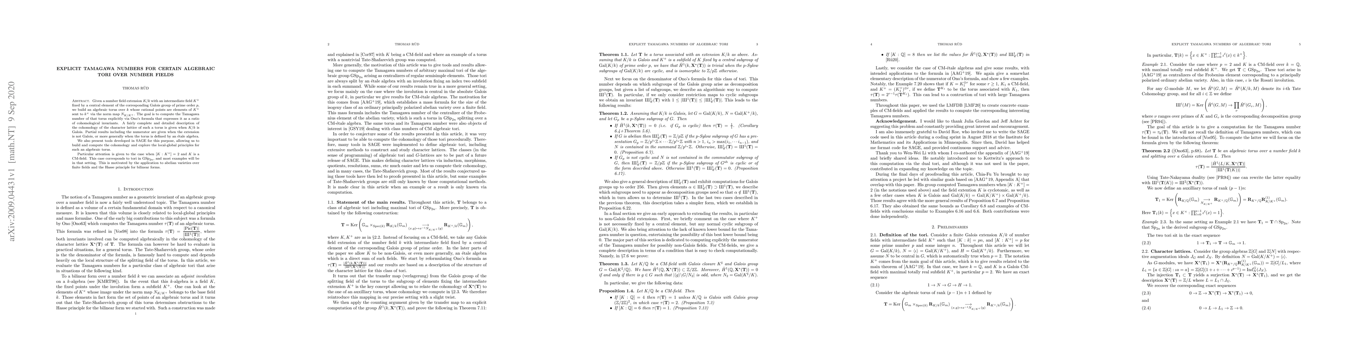 Given a number field extension $K/k$ with an intermediate field $K^+$ fixed by a central element of the corresponding Galois group of prime order $p$, we build an algebraic torus over $k$ whose rational points are elements of $K^\times$ sent to $k^\times$ via the norm map $N_{K/K^+}$. The goal is to compute the Tamagawa number of that torus explicitly via Ono's formula that expresses it as a ratio of cohomological invariants. A fairly complete and detailed description of the cohomology of the character lattice of such a torus is given when $K/k$ is Galois. Partial results including the numerator are given when the extension is not Galois, or more generally when the torus is defined by an \'etale algebra. We also present tools developed in SAGE for this purpose, allowing us to build and compute the cohomology and explore the local-global principles for such an algebraic torus. Particular attention is given to the case when $[K:K^+]=2$ and $K$ is a CM-field. This case corresponds to tori in $\mathrm{GSp}_{2n}$, and most examples will be in that setting. This is motivated by the application to abelian varieties over finite fields and the Hasse principle for bilinear forms.