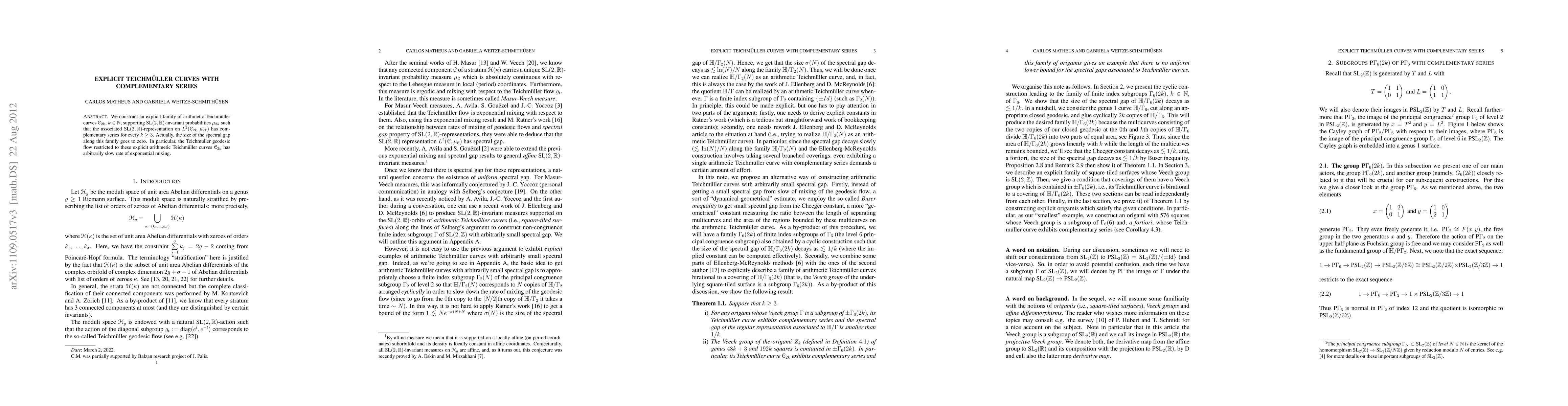 This paper constructs explicit arithmetic Teichmüller curves $\mathcal{C}_{2k}$ with $\textrm{SL}(2,\mathbb{R})$-invariant probabilities $\mu_{2k}$, showing that the $\textrm{SL}(2,\mathbb{R})$-representation on $L^2(\mathcal{C}_{2k},\mu_{2k})$ has complementary series for $k\geq 3$, and demonstrates that the spectral gap along these curves tends to zero, indicating arbitrarily slow exponential mixing in the Teichmüller geodesic flow.