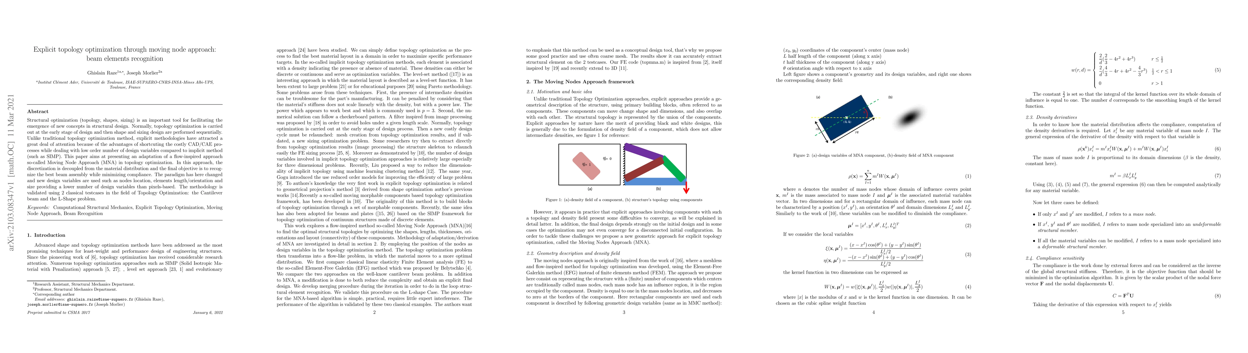 Structural optimization (topology, shapes, sizing) is an important tool for facilitating the emergence of new concepts in structural design. Normally, topology optimization is carried out at the early stage of design and then shape and sizing design are performed sequentially. Unlike traditional topology optimization method, explicit methodologies have attracted a great deal of attention because of the advantages of shortcuting the costly CAD/CAE processes while dealing with low order number of design variables compared to implicit method (such as SIMP). This paper aims at presenting an adaptation of a flow-inspired approach so-called Moving Node Approach (MNA) in topology optimization. In this approach, the discretization is decoupled from the material distribution and the final objective is to recognize the best beam assembly while minimizing compliance. The paradigm has here changed and new design variables are used such as nodes location, elements length/orientation and size providing a lower number of design variables than pixels-based. The methodology is validated using 2 classical testcases in the field of Topology Optimization: the Cantilever beam and the L-Shape problem.
