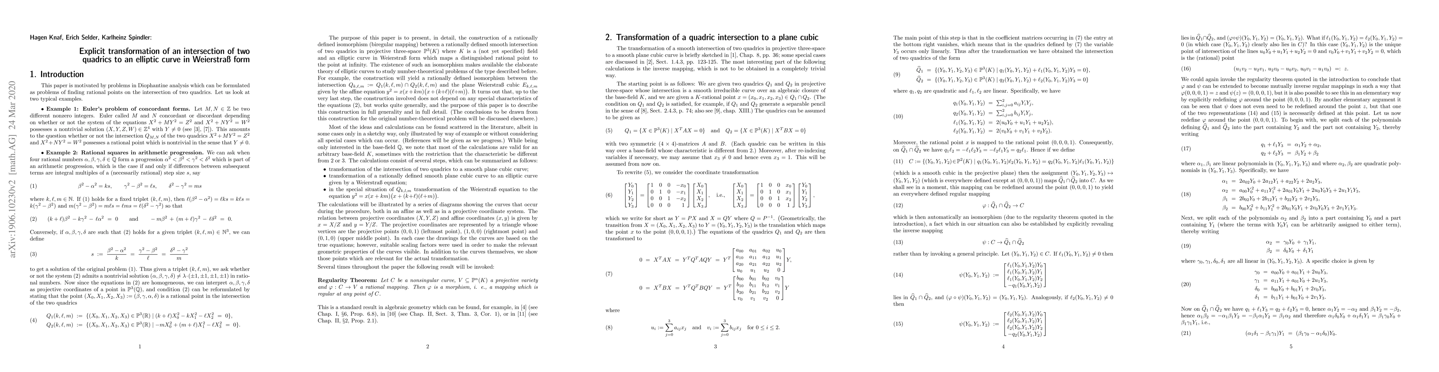 Researchers develop an explicit method to transform the intersection of two quadrics into a Weierstrass form elliptic curve, enabling solutions to Diophantine analysis problems, such as Euler's problem of concordant forms.