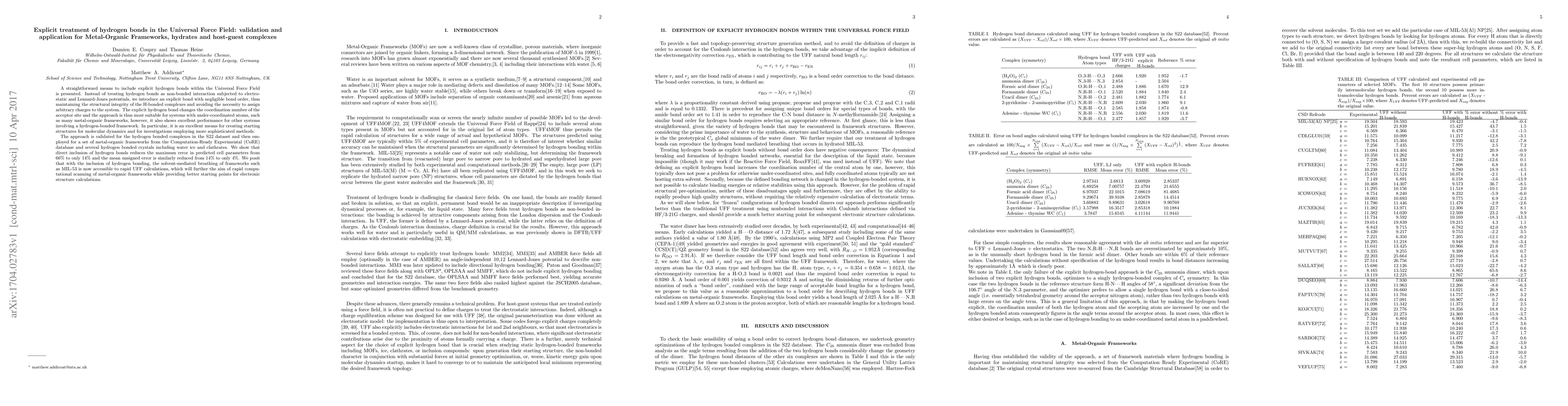 This paper introduces an explicit hydrogen bond treatment within the Universal Force Field, enhancing its accuracy for metal-organic frameworks and hydrates. The method significantly reduces errors in predicting cell parameters, improving the force field's applicability for molecular dynamics and electronic structure calculations.