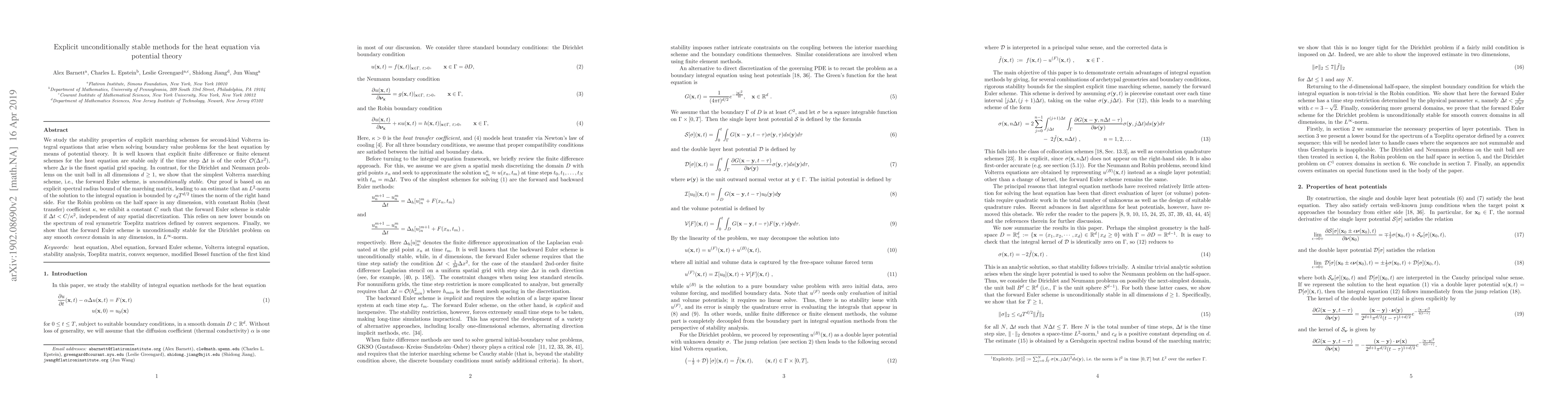 This research demonstrates that integral equation methods can be explicit and unconditionally stable for the heat equation, contrasting with finite difference methods that typically require $O(\Delta t/\Delta x^2)$.