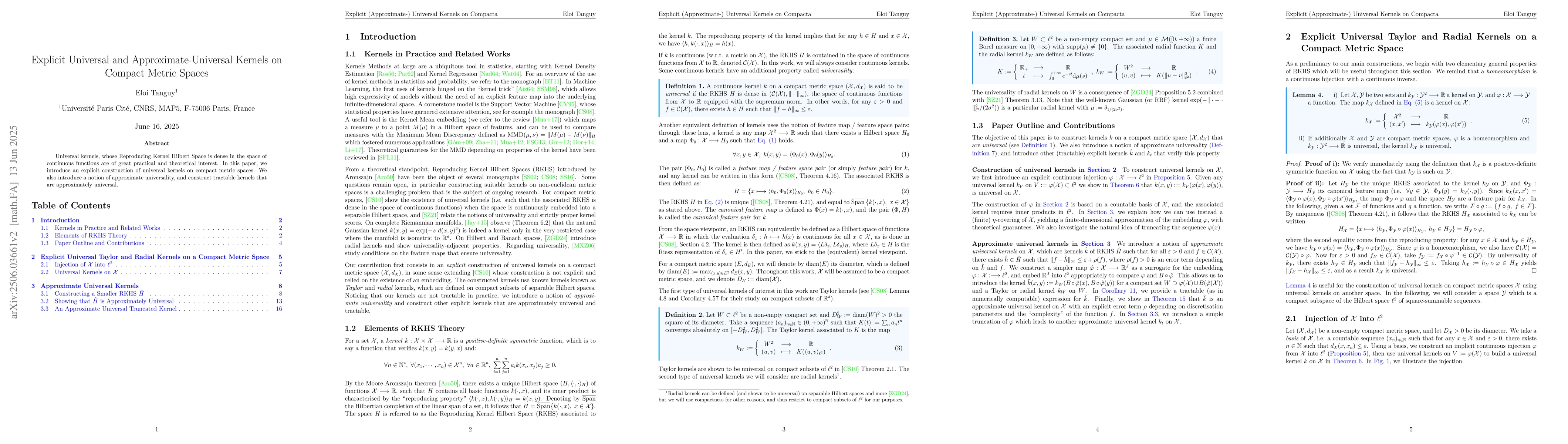 The paper introduces explicit constructions of universal kernels on compact metric spaces and defines approximate universality, constructing tractable kernels that are approximately universal.