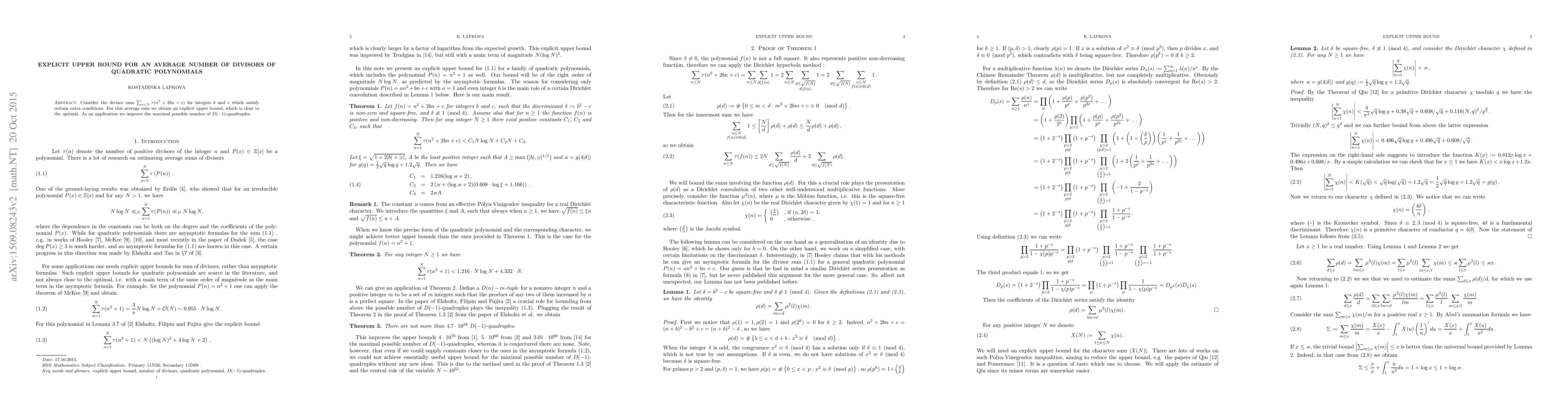 Researchers found an explicit upper bound for the average number of divisors of quadratic polynomials, improving a related application in finding quadruples.