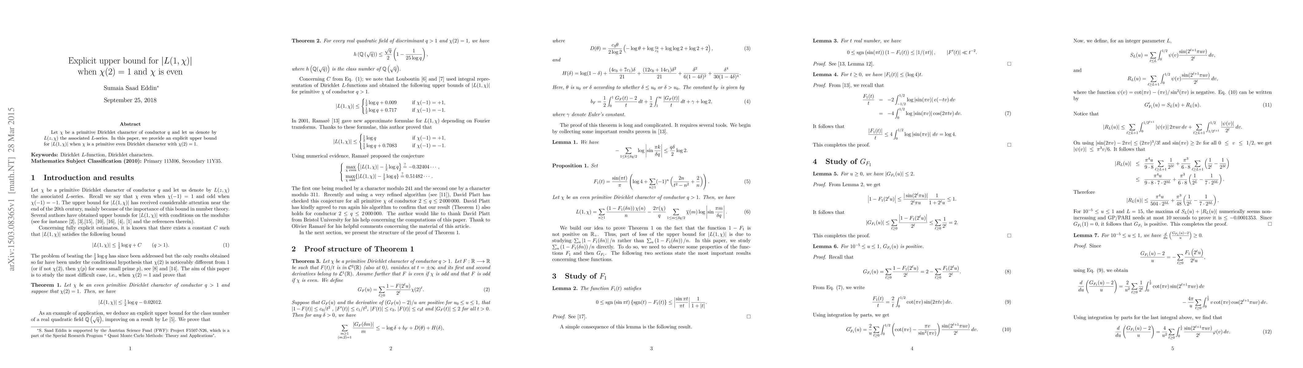Summary: This paper presents an explicit upper bound for the magnitude of the $L$-series $L(1, \chi)$ for primitive even Dirichlet characters $\chi$ with $\chi(2)=1$. The result provides a quantitative measure for these specific character values.