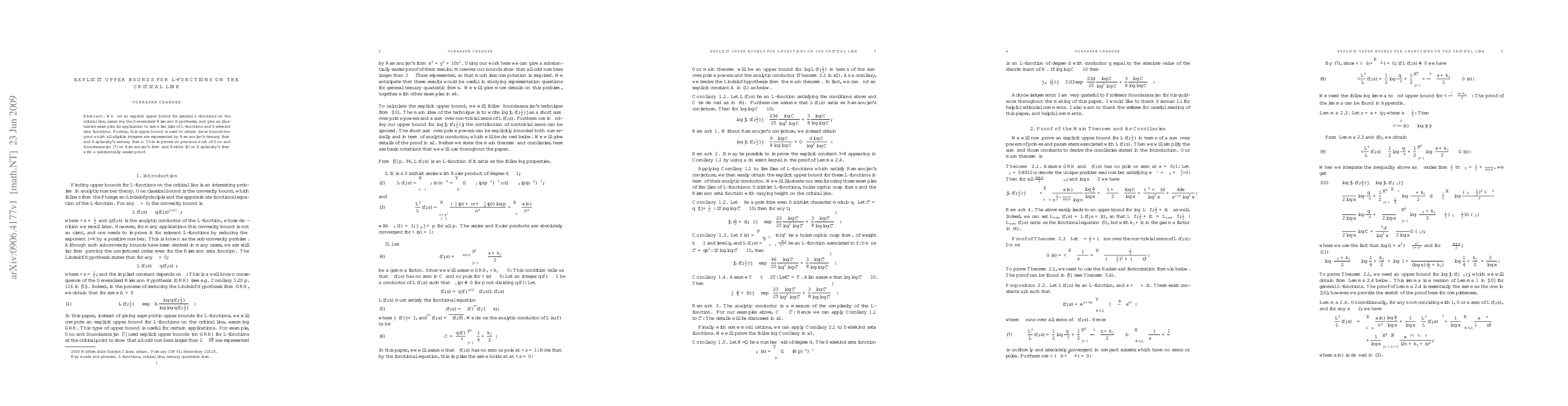 This paper establishes an explicit upper bound for $L$-functions on the critical line under the Generalized Riemann Hypothesis, applying it to families of $L$-functions and Dedekind zeta functions. It also improves previous results on representations by Ramanujan's and Kaplansky's ternary forms with a simpler proof.