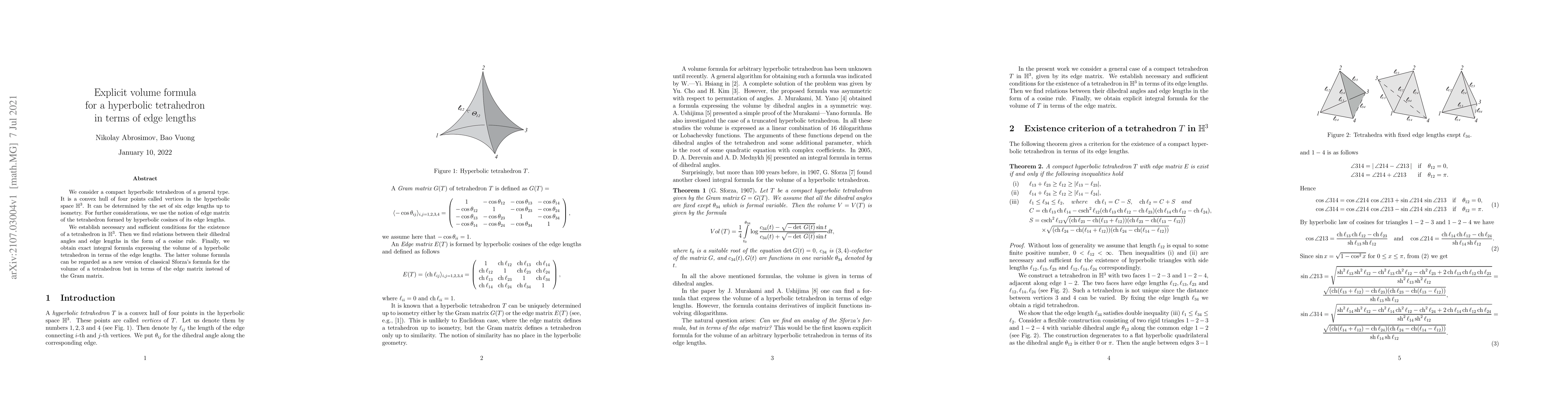 This paper derives an explicit integral formula for the volume of a hyperbolic tetrahedron in $\mathbb{H}^3$ based on its edge lengths, establishing necessary conditions for its existence and relating dihedral angles to edge lengths via a cosine rule. The volume formula is a hyperbolic version of Sforza's classical formula, expressed in terms of an edge matrix instead of the Gram matrix.