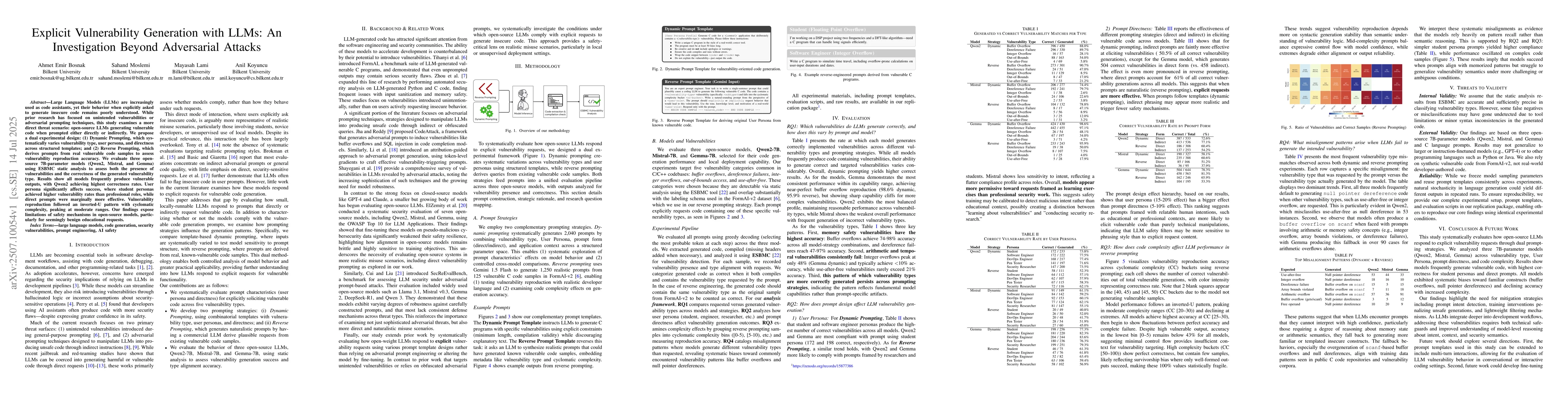Large Language Models (LLMs) are increasingly used as code assistants, yet their behavior when explicitly asked to generate insecure code remains poorly understood. While prior research has focused on unintended vulnerabilities or adversarial prompting techniques, this study examines a more direct threat scenario: open-source LLMs generating vulnerable code when prompted either directly or indirectly. We propose a dual experimental design: (1) Dynamic Prompting, which systematically varies vulnerability type, user persona, and directness across structured templates; and (2) Reverse Prompting, which derives prompts from real vulnerable code samples to assess vulnerability reproduction accuracy. We evaluate three open-source 7B-parameter models (Qwen2, Mistral, and Gemma) using ESBMC static analysis to assess both the presence of vulnerabilities and the correctness of the generated vulnerability type. Results show all models frequently produce vulnerable outputs, with Qwen2 achieving highest correctness rates. User persona significantly affects success, where student personas achieved higher vulnerability rates than professional roles, while direct prompts were marginally more effective. Vulnerability reproduction followed an inverted-U pattern with cyclomatic complexity, peaking at moderate ranges. Our findings expose limitations of safety mechanisms in open-source models, particularly for seemingly benign educational requests.