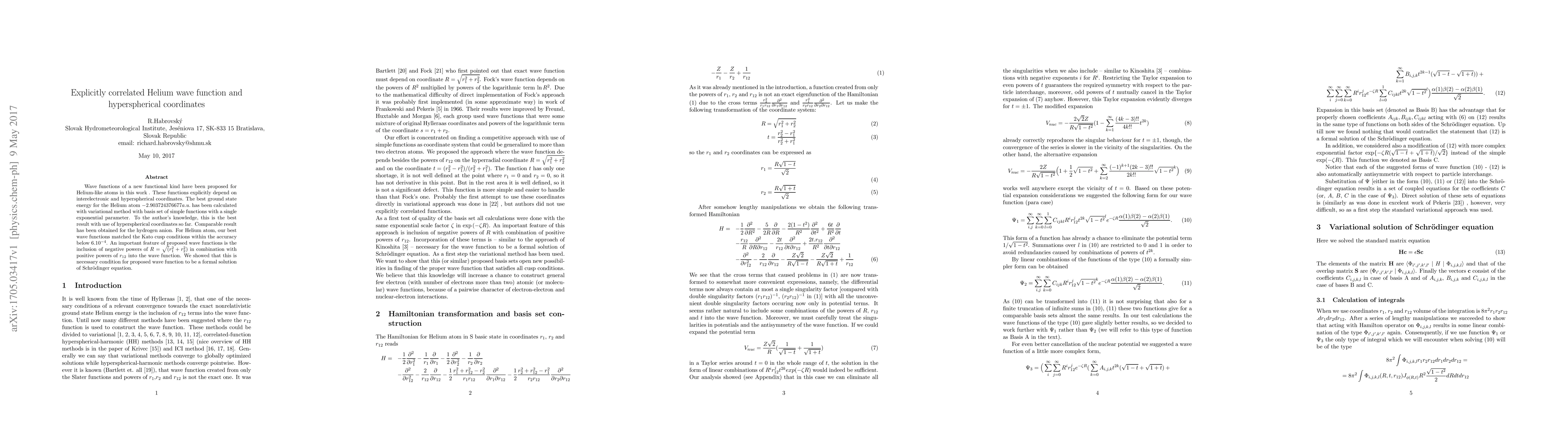 Wave functions of a new functional kind have been proposed for Helium-like atoms in this work . These functions explicitly depend on interelectronic and hyperspherical coordinates. The best ground state energy for the Helium atom $ -2.903724376677 a.u.$ has been calculated with variational method with basis set of simple functions with a single exponential parameter. To the author's knowledge, this is the best result with use of hyperspherical coordinates so far. Comparable result has been obtained for the hydrogen anion. For Helium atom, our best wave functions matched the Kato cusp conditions within the accuracy below $6.10^{-4} $. An important feature of proposed wave functions is the inclusion of negative powers of $R=\sqrt(r^{2}_{1}+r^{2}_{2})$ in combination with positive powers of $r_{12}$ into the wave function. We showed that this is necessary condition for proposed wave function to be a formal solution of Schr\"odinger equation.