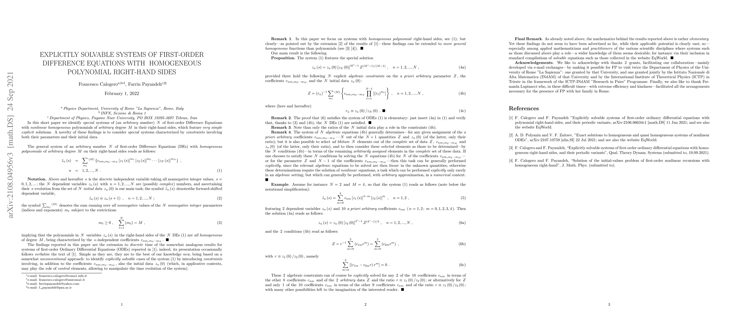 In this short paper we identify special systems of (an arbitrary number) N of first-order Difference Equations with nonlinear homogeneous polynomials of arbitrary degree M in their right-hand sides, which feature very simple explicit solutions. A novelty of these findings is to consider special systems characterized by constraints involving both their parameters and their initial data