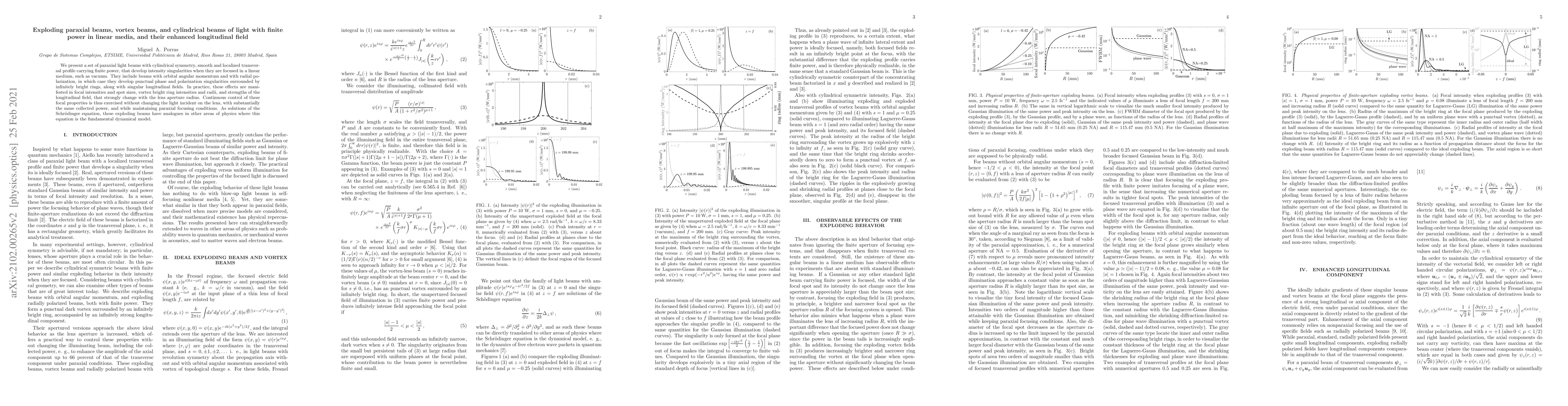 We present a set of paraxial light beams with cylindrical symmetry, smooth and localized transversal profile carrying finite power, that develop intensity singularities when they are focused in a linear medium, such as vacuum. They include beams with orbital angular momentum and with radial polarization, in which case they develop punctual phase and polarization singularities surrounded by infinitely bright rings, along with singular longitudinal fields. In practice, these effects are manifested in focal intensities and spot sizes, vortex bright ring intensities and radii, and strengths of the longitudinal field, that strongly change with the lens aperture radius. Continuous control of these focal properties is thus exercised without changing the light incident on the lens, with substantially the same collected power, and while maintaining paraxial focusing conditions. As solutions of the Schr\"odinger equation, these exploding beams have analogues in other areas of physics where this equation is the fundamental dynamical model.