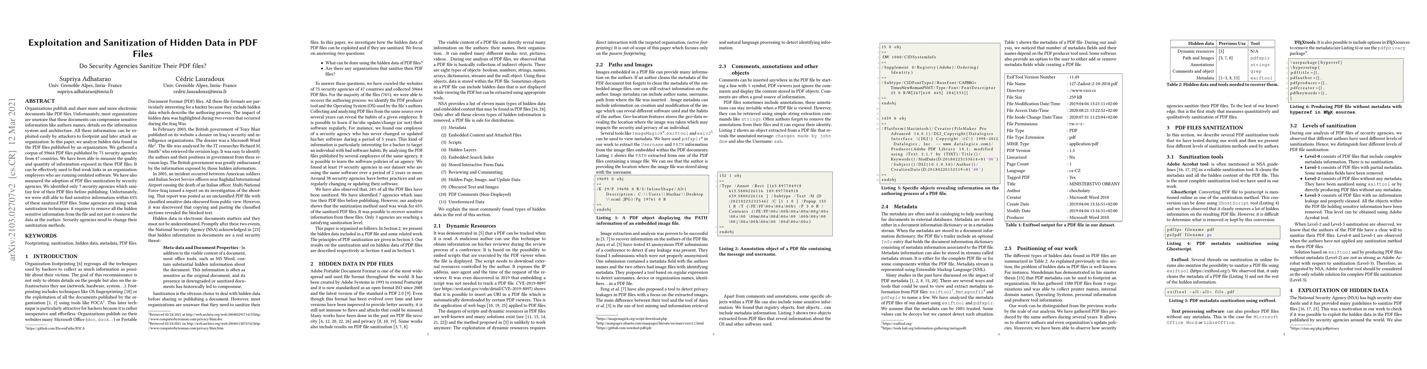 This paper investigates hidden data in PDF files from 75 security agencies, revealing widespread exposure of sensitive information such as author names and system architecture details. It finds that only 7 agencies sanitize PDFs, but even these often fail to remove all hidden data, leaving 65% of sanitized files still vulnerable.