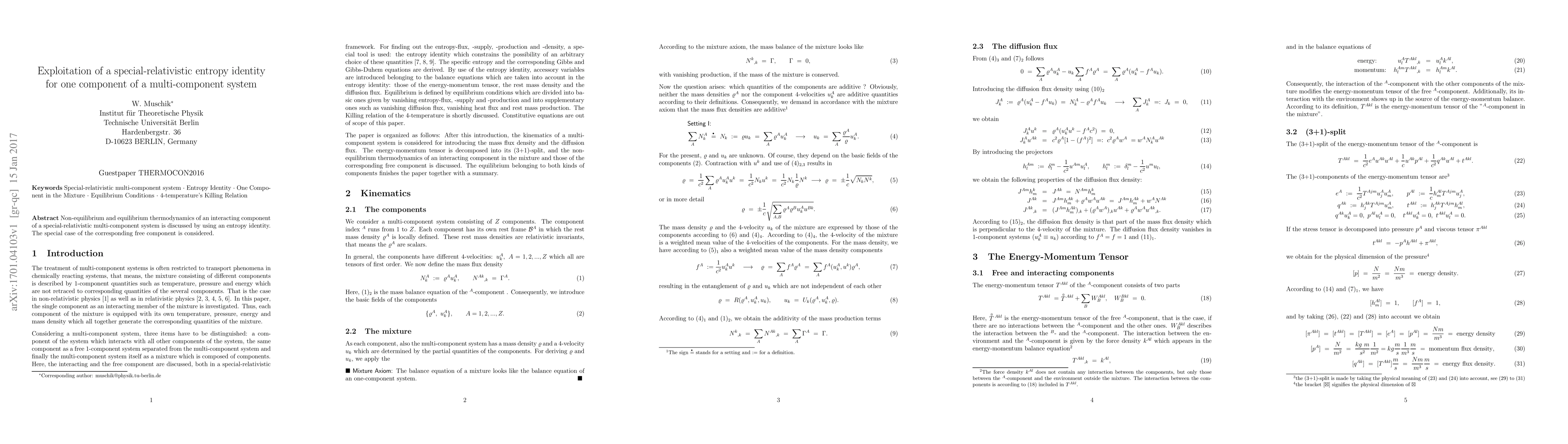 Non-equilibrium and equilibrium thermodynamics of an interacting component of a special-relativistic multi-component system is discussed by using an entropy identity. The special case of the corresponding free component is considered.