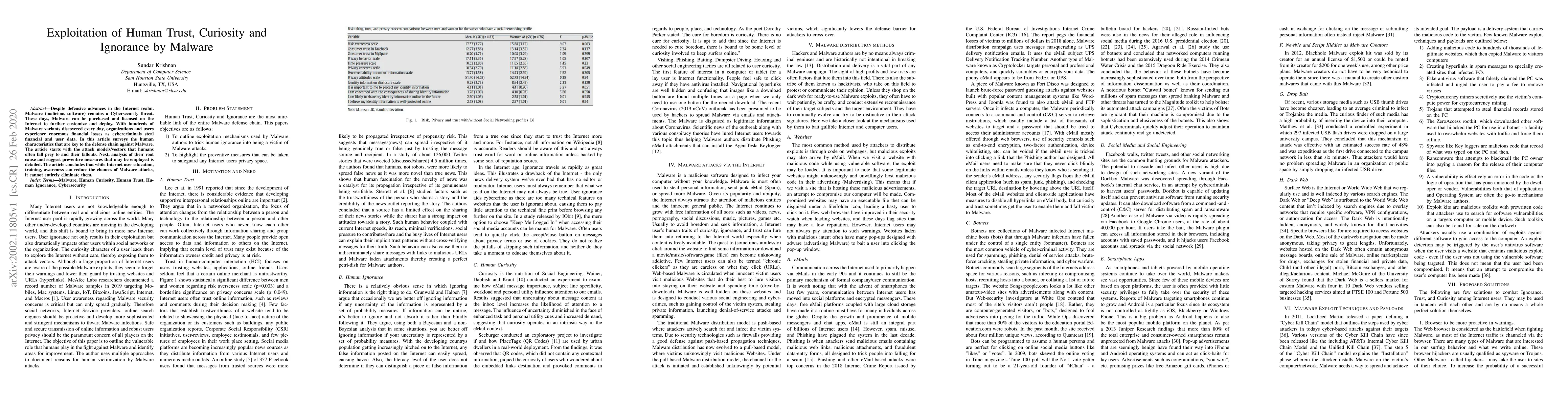 Despite defensive advances in the Internet realm, Malware (malicious software) remains a Cybersecurity threat. These days, Malware can be purchased and licensed on the Internet to further customize and deploy. With hundreds of Malware variants discovered every day, organizations and users experience enormous financial losses as cybercriminals steal financial and user data. In this article surveys the human characteristics that are key to the defense chain against Malware. The article starts with the attack models/vectors that humans often fall prey to and their fallouts. Next, analysis of their root cause and suggest preventive measures that may be employed is detailed. The article concludes that while Internet user education, training, awareness can reduce the chances of Malware attacks,it cannot entirely eliminate them.