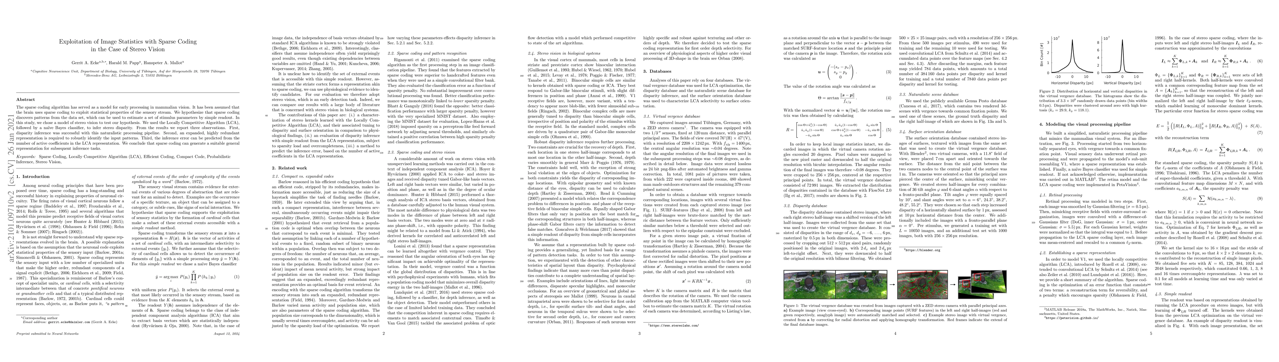 This study explores how sparse coding, modeled by the Locally Competitive Algorithm, can exploit image statistics in stereo vision. The results show successful disparity inference, the necessity of a redundant representation for robust pattern identification, and a correlation between inference error and active coefficients in the sparse coding representation.