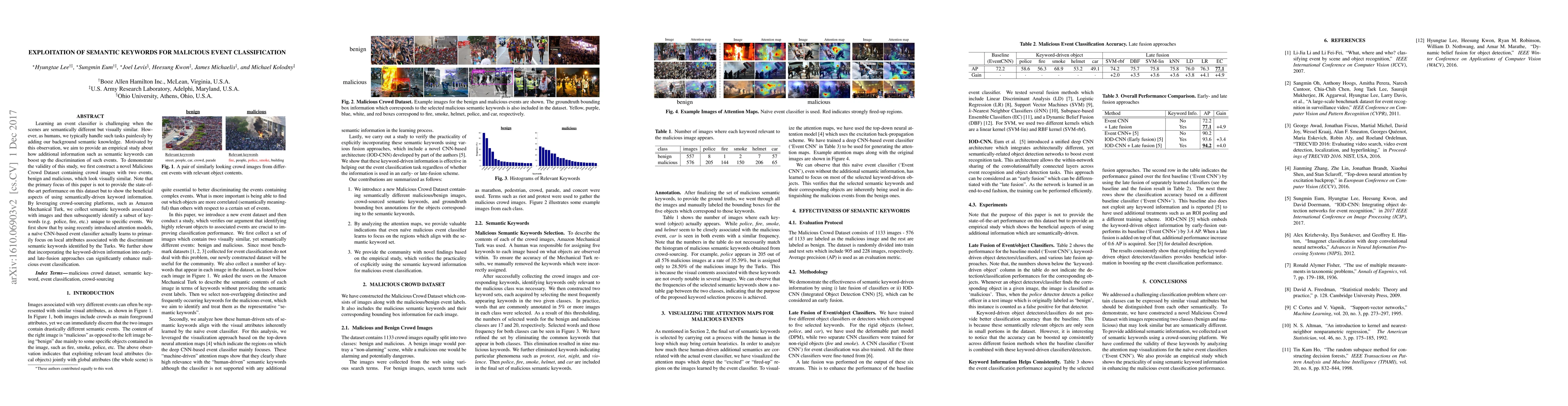Learning an event classifier is challenging when the scenes are semantically different but visually similar. However, as humans, we typically handle such tasks painlessly by adding our background semantic knowledge. Motivated by this observation, we aim to provide an empirical study about how additional information such as semantic keywords can boost up the discrimination of such events. To demonstrate the validity of this study, we first construct a novel Malicious Crowd Dataset containing crowd images with two events, benign and malicious, which look visually similar. Note that the primary focus of this paper is not to provide the state-of-the-art performance on this dataset but to show the beneficial aspects of using semantically-driven keyword information. By leveraging crowd-sourcing platforms, such as Amazon Mechanical Turk, we collect semantic keywords associated with images and then subsequently identify a subset of keywords (e.g. police, fire, etc.) unique to specific events. We first show that by using recently introduced attention models, a naive CNN-based event classifier actually learns to primarily focus on local attributes associated with the discriminant semantic keywords identified by the Turks. We further show that incorporating the keyword-driven information into early- and late-fusion approaches can significantly enhance malicious event classification.