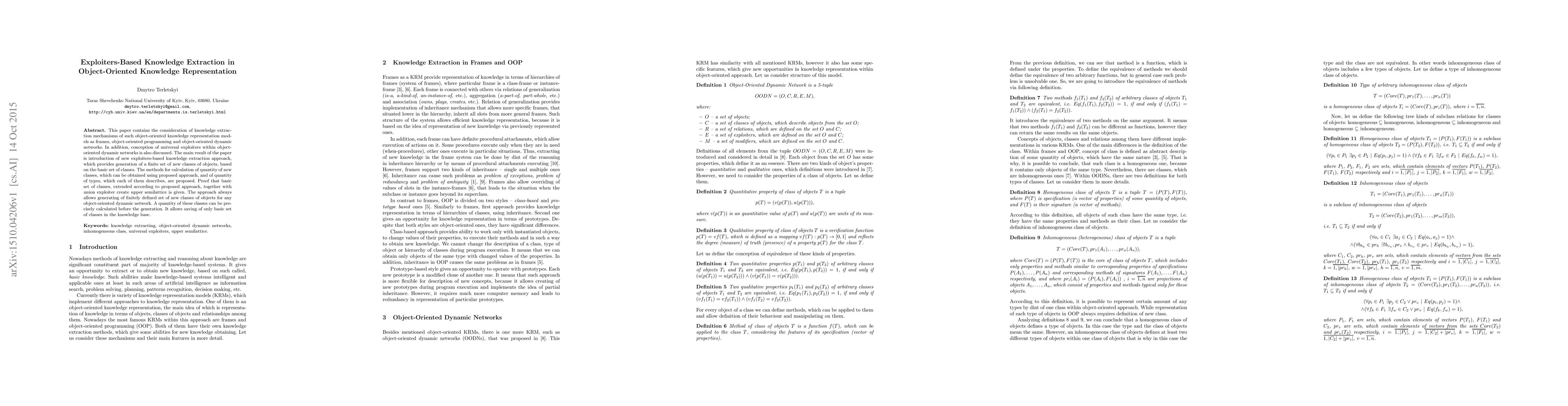 This paper contains the consideration of knowledge extraction mechanisms of such object-oriented knowledge representation models as frames, object-oriented programming and object-oriented dynamic networks. In addition, conception of universal exploiters within object-oriented dynamic networks is also discussed. The main result of the paper is introduction of new exploiters-based knowledge extraction approach, which provides generation of a finite set of new classes of objects, based on the basic set of classes. The methods for calculation of quantity of new classes, which can be obtained using proposed approach, and of quantity of types, which each of them describes, are proposed. Proof that basic set of classes, extended according to proposed approach, together with union exploiter create upper semilattice is given. The approach always allows generating of finitely defined set of new classes of objects for any object-oriented dynamic network. A quantity of these classes can be precisely calculated before the generation. It allows saving of only basic set of classes in the knowledge base.