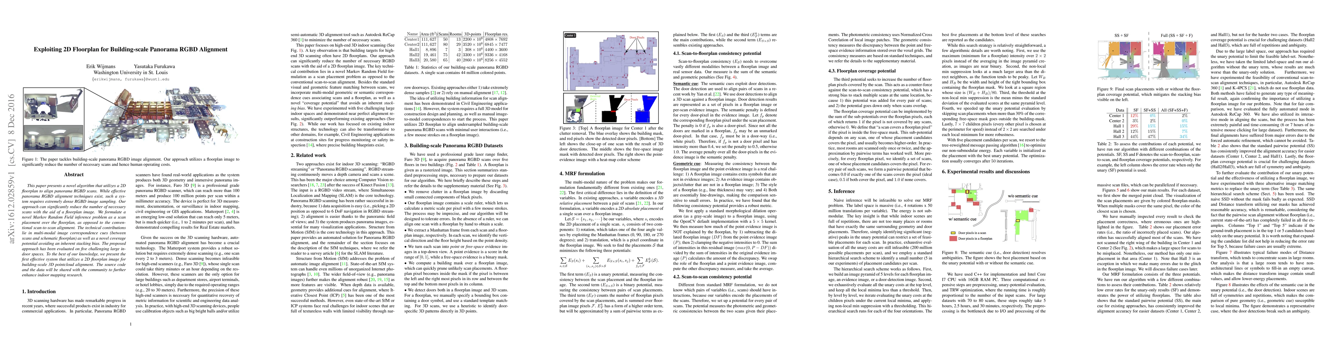 This paper introduces an algorithm leveraging a 2D floorplan to align building-scale panorama RGBD scans, significantly reducing the number of required scans compared to conventional methods. The approach formulates a novel Markov Random Field inference problem, utilizing multi-modal image correspondence cues and a new coverage potential to avoid stacking bias.