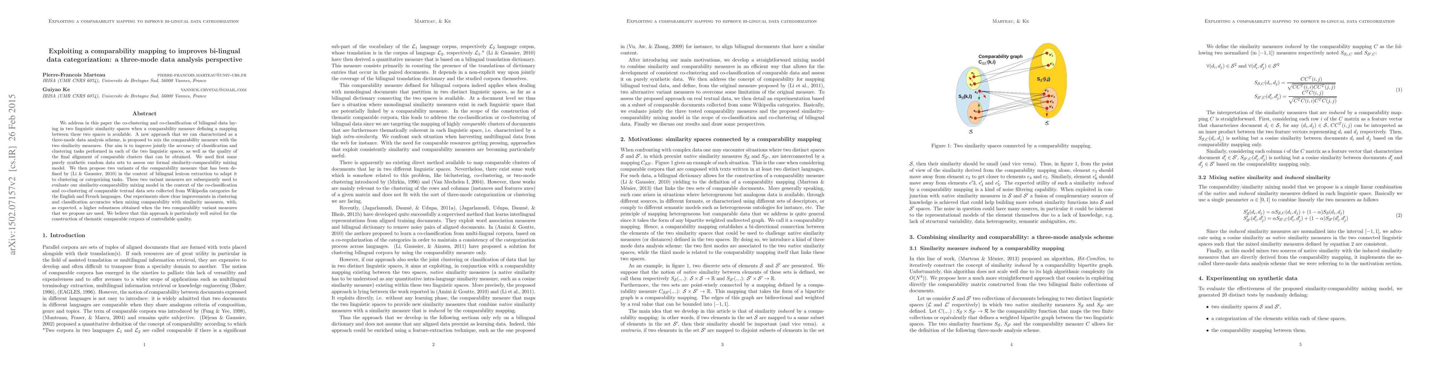 We address in this paper the co-clustering and co-classification of bilingual data laying in two linguistic similarity spaces when a comparability measure defining a mapping between these two spaces is available. A new approach that we can characterized as a three-mode analysis scheme, is proposed to mix the comparability measure with the two similarity measures. Our aim is to improve jointly the accuracy of classification and clustering tasks performed in each of the two linguistic spaces, as well as the quality of the final alignment of comparable clusters that can be obtained. We used first some purely synthetic random data sets to assess our formal similarity-comparability mixing model. We then propose two variants of the comparability measure that has been defined by (Li and Gaussier 2010) in the context of bilingual lexicon extraction to adapt it to clustering or categorizing tasks. These two variant measures are subsequently used to evaluate our similarity-comparability mixing model in the context of the co-classification and co-clustering of comparable textual data sets collected from Wikipedia categories for the English and French languages. Our experiments show clear improvements in clustering and classification accuracies when mixing comparability with similarity measures, with, as expected, a higher robustness obtained when the two comparability variant measures that we propose are used. We believe that this approach is particularly well suited for the construction of thematic comparable corpora of controllable quality.