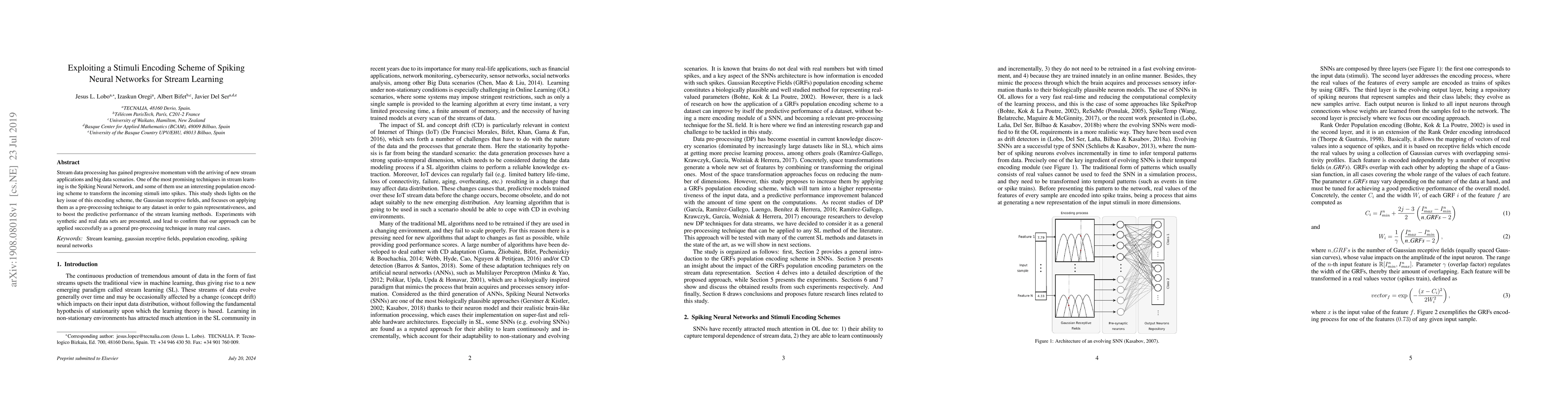 A study investigates applying a pre-processing technique to stream data using Gaussian receptive fields in Spiking Neural Networks, improving predictive performance with synthetic and real datasets.
