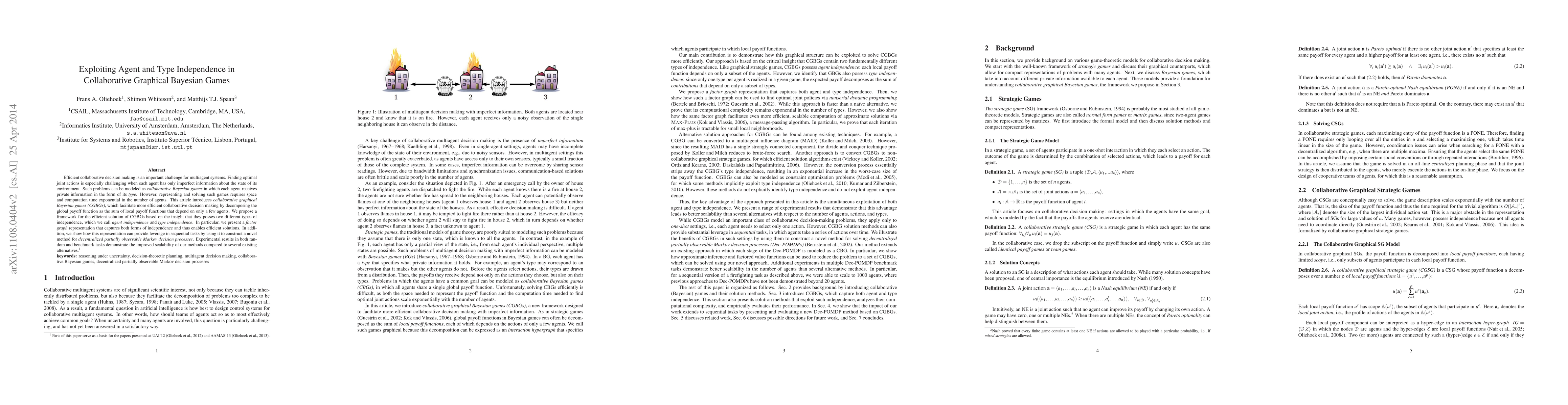 Efficient collaborative decision making is an important challenge for multiagent systems. Finding optimal joint actions is especially challenging when each agent has only imperfect information about the state of its environment. Such problems can be modeled as collaborative Bayesian games in which each agent receives private information in the form of its type. However, representing and solving such games requires space and computation time exponential in the number of agents. This article introduces collaborative graphical Bayesian games (CGBGs), which facilitate more efficient collaborative decision making by decomposing the global payoff function as the sum of local payoff functions that depend on only a few agents. We propose a framework for the efficient solution of CGBGs based on the insight that they posses two different types of independence, which we call agent independence and type independence. In particular, we present a factor graph representation that captures both forms of independence and thus enables efficient solutions. In addition, we show how this representation can provide leverage in sequential tasks by using it to construct a novel method for decentralized partially observable Markov decision processes. Experimental results in both random and benchmark tasks demonstrate the improved scalability of our methods compared to several existing alternatives.