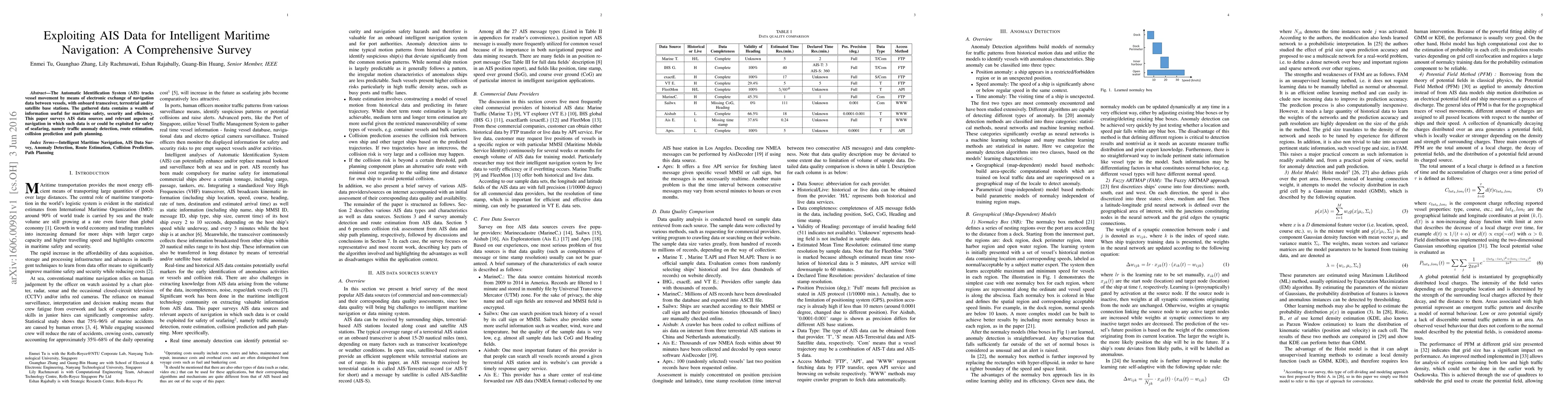 This paper conducts a comprehensive survey on exploiting AIS data for intelligent maritime navigation, focusing on traffic anomaly detection, route estimation, collision prediction, and path planning. It reviews various models including lateral, ship, learning (neural network, Gaussian process, and extended Kalman filter), and hybrid models (Type I and Type II), along with minor principal component analysis and other methods.
