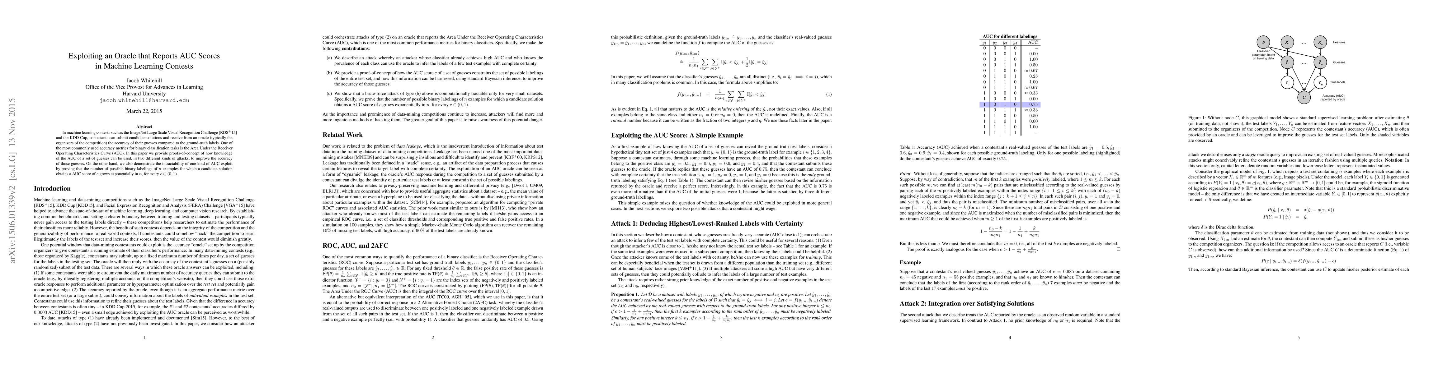 Researchers found that knowing an oracle's AUC scores can help improve guesses in machine learning contests, but also showed that this knowledge can lead to exponential growth in possible binary labelings.