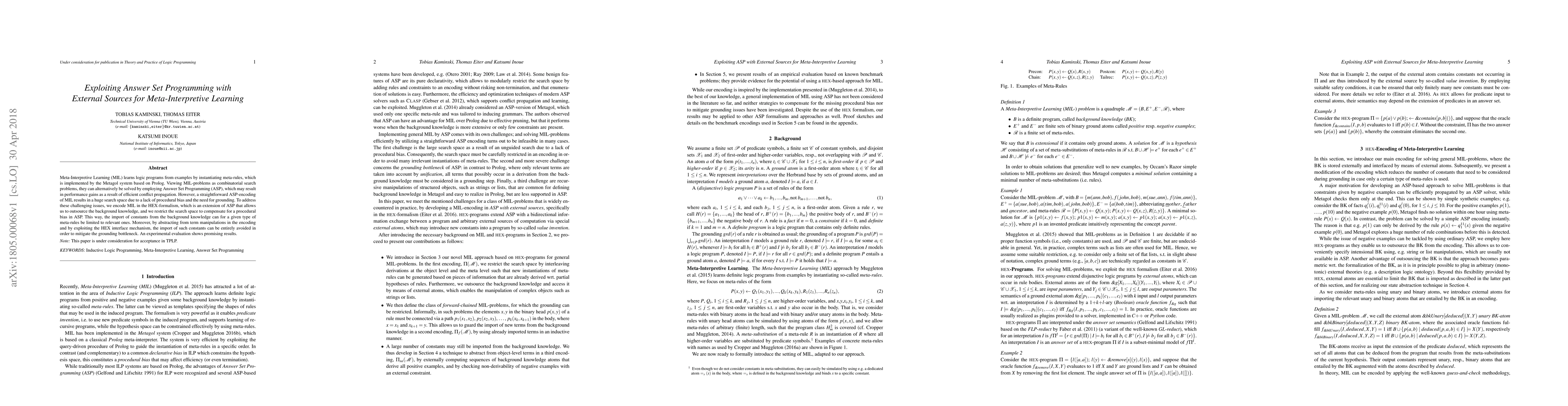 This paper explores using Answer Set Programming (ASP) with external sources to enhance Meta-Interpretive Learning (MIL) by encoding MIL in the HEX-formalism, which restricts the search space and mitigates the grounding bottleneck, resulting in performance gains. Experimental results indicate promising improvements.