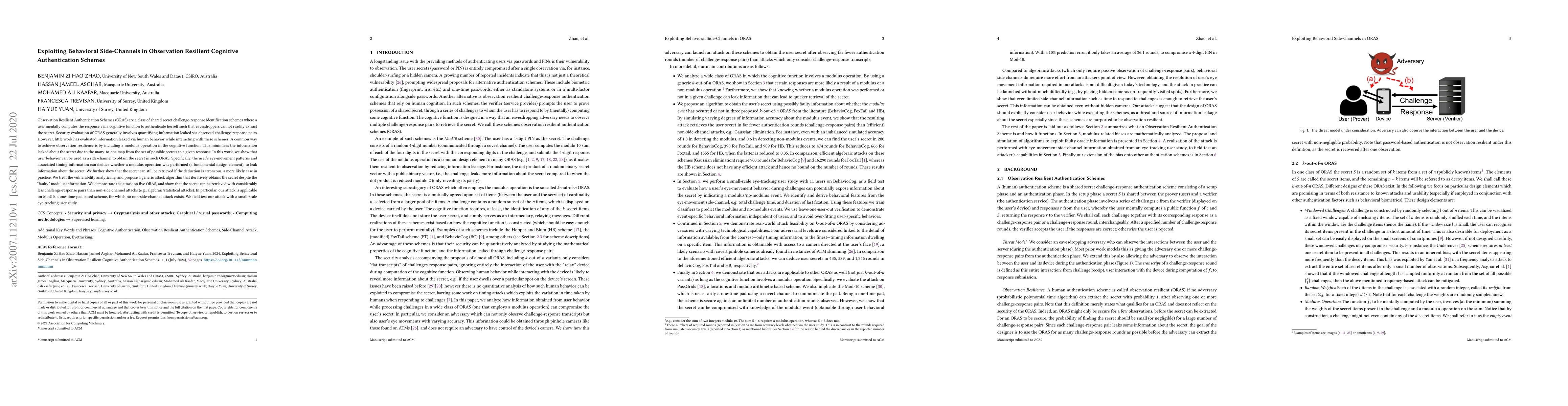 Researchers discovered that behavioral side-channels in observation resilient cognitive authentication schemes can leak secret information through user behavior, such as eye movement patterns.
