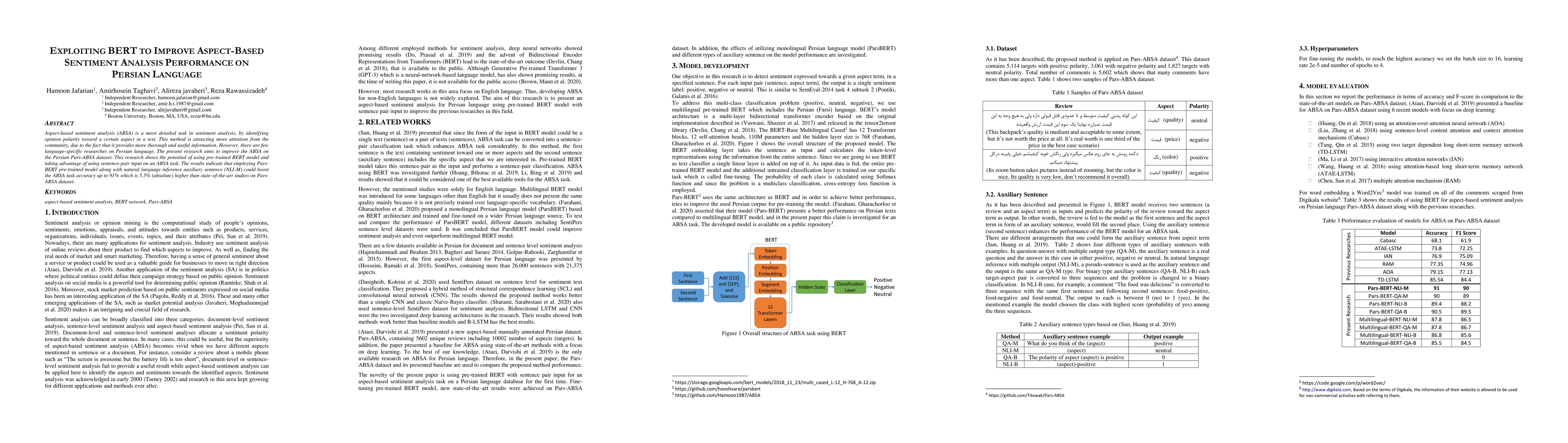 Aspect-based sentiment analysis (ABSA) is a more detailed task in sentiment analysis, by identifying opinion polarity toward a certain aspect in a text. This method is attracting more attention from the community, due to the fact that it provides more thorough and useful information. However, there are few language-specific researches on Persian language. The present research aims to improve the ABSA on the Persian Pars-ABSA dataset. This research shows the potential of using pre-trained BERT model and taking advantage of using sentence-pair input on an ABSA task. The results indicate that employing Pars-BERT pre-trained model along with natural language inference auxiliary sentence (NLI-M) could boost the ABSA task accuracy up to 91% which is 5.5% (absolute) higher than state-of-the-art studies on Pars-ABSA dataset.