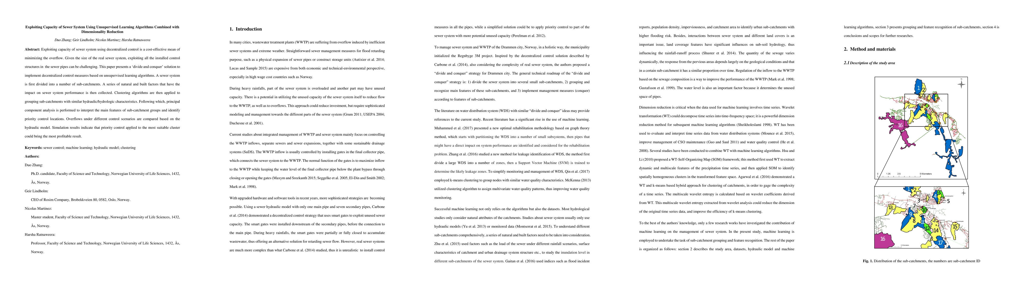 Exploiting capacity of sewer system using decentralized control is a cost effective mean of minimizing the overflow. Given the size of the real sewer system, exploiting all the installed control structures in the sewer pipes can be challenging. This paper presents a divide and conquer solution to implement decentralized control measures based on unsupervised learning algorithms. A sewer system is first divided into a number of subcatchments. A series of natural and built factors that have the impact on sewer system performance is then collected. Clustering algorithms are then applied to grouping subcatchments with similar hydraulic hydrologic characteristics. Following which, principal component analysis is performed to interpret the main features of sub-catchment groups and identify priority control locations. Overflows under different control scenarios are compared based on the hydraulic model. Simulation results indicate that priority control applied to the most suitable cluster could bring the most profitable result.
