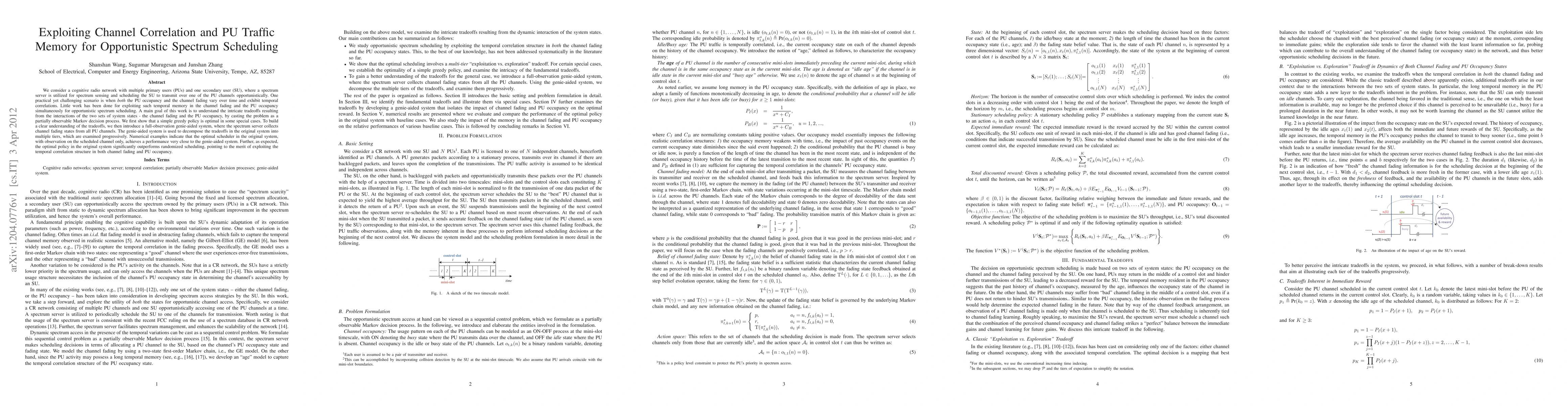 We consider a cognitive radio network with multiple primary users (PUs) and one secondary user (SU), where a spectrum server is utilized for spectrum sensing and scheduling the SU to transmit over one of the PU channels opportunistically. One practical yet challenging scenario is when \textit{both} the PU occupancy and the channel fading vary over time and exhibit temporal correlations. Little work has been done for exploiting such temporal memory in the channel fading and the PU occupancy simultaneously for opportunistic spectrum scheduling. A main goal of this work is to understand the intricate tradeoffs resulting from the interactions of the two sets of system states - the channel fading and the PU occupancy, by casting the problem as a partially observable Markov decision process. We first show that a simple greedy policy is optimal in some special cases. To build a clear understanding of the tradeoffs, we then introduce a full-observation genie-aided system, where the spectrum server collects channel fading states from all PU channels. The genie-aided system is used to decompose the tradeoffs in the original system into multiple tiers, which are examined progressively. Numerical examples indicate that the optimal scheduler in the original system, with observation on the scheduled channel only, achieves a performance very close to the genie-aided system. Further, as expected, the optimal policy in the original system significantly outperforms randomized scheduling, pointing to the merit of exploiting the temporal correlation structure in both channel fading and PU occupancy.