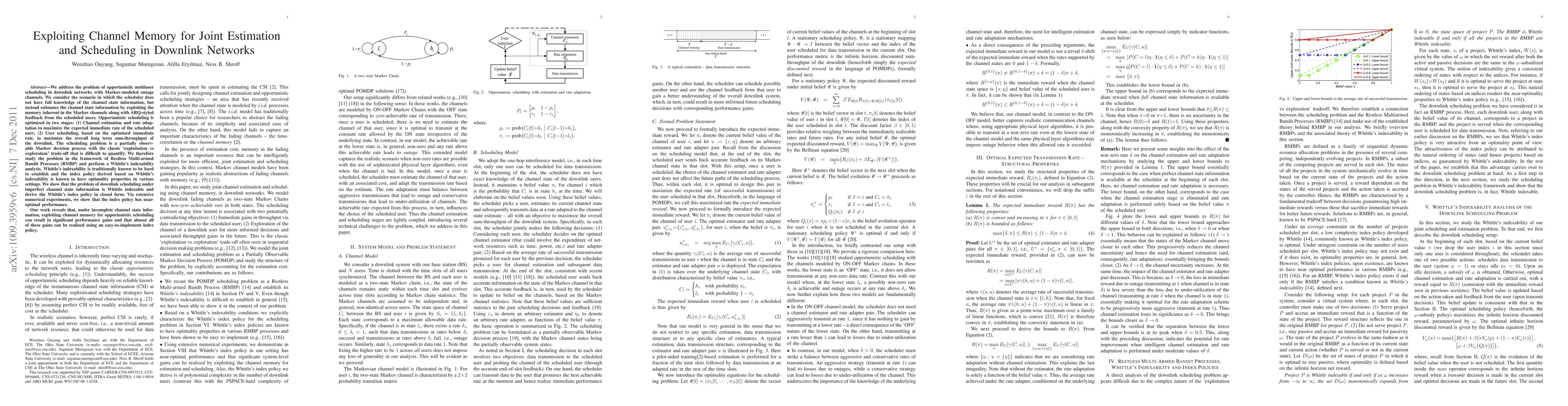 We address the problem of opportunistic multiuser scheduling in downlink networks with Markov-modeled outage channels. We consider the scenario in which the scheduler does not have full knowledge of the channel state information, but instead estimates the channel state information by exploiting the memory inherent in the Markov channels along with ARQ-styled feedback from the scheduled users. Opportunistic scheduling is optimized in two stages: (1) Channel estimation and rate adaptation to maximize the expected immediate rate of the scheduled user; (2) User scheduling, based on the optimized immediate rate, to maximize the overall long term sum-throughput of the downlink. The scheduling problem is a partially observable Markov decision process with the classic 'exploitation vs exploration' trade-off that is difficult to quantify. We therefore study the problem in the framework of Restless Multi-armed Bandit Processes (RMBP) and perform a Whittle's indexability analysis. Whittle's indexability is traditionally known to be hard to establish and the index policy derived based on Whittle's indexability is known to have optimality properties in various settings. We show that the problem of downlink scheduling under imperfect channel state information is Whittle indexable and derive the Whittle's index policy in closed form. Via extensive numerical experiments, we show that the index policy has near-optimal performance. Our work reveals that, under incomplete channel state information, exploiting channel memory for opportunistic scheduling can result in significant performance gains and that almost all of these gains can be realized using an easy-to-implement index policy.