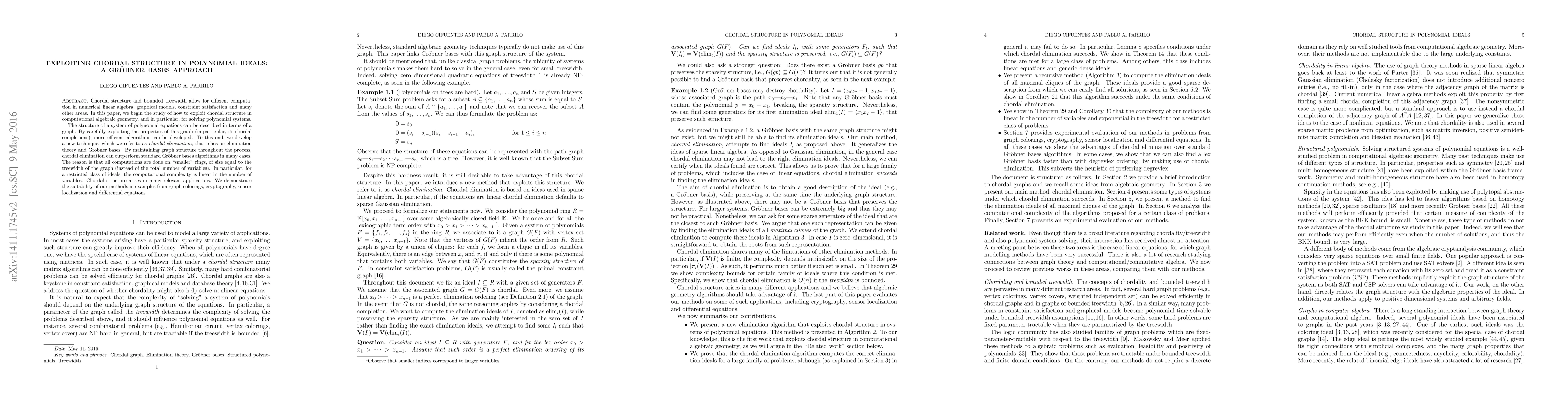 This paper introduces a new technique called chordal elimination that exploits chordal structure in polynomial ideals to solve systems of polynomial equations more efficiently than traditional Gr"obner basis algorithms, with applications in graph colorings, cryptography, sensor localization, and differential equations.