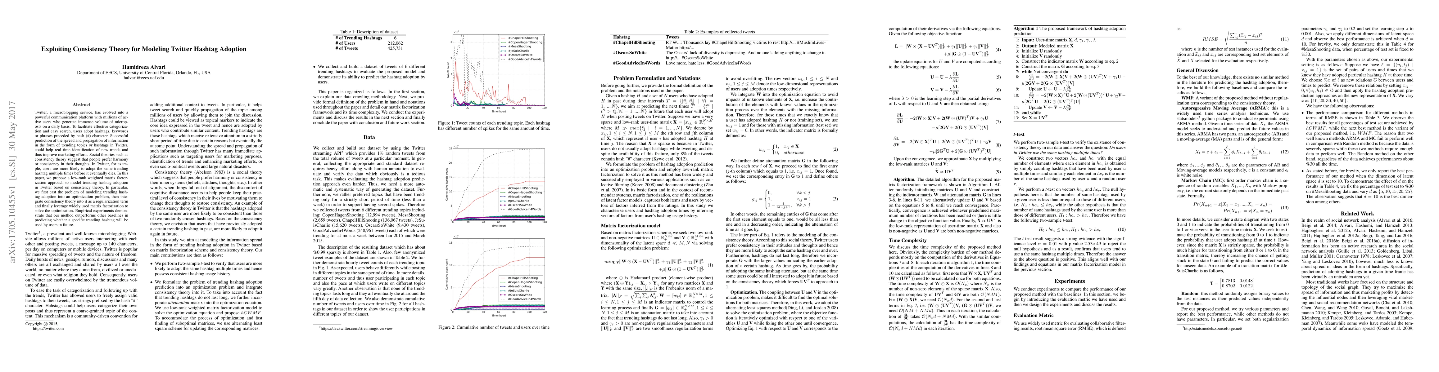 This paper proposes a low-rank weighted matrix factorization approach to model the adoption of trending hashtags on Twitter, integrating consistency theory as a regularization term to predict future hashtag usage. Empirical results show that the method outperforms other baselines in forecasting hashtag trends.
