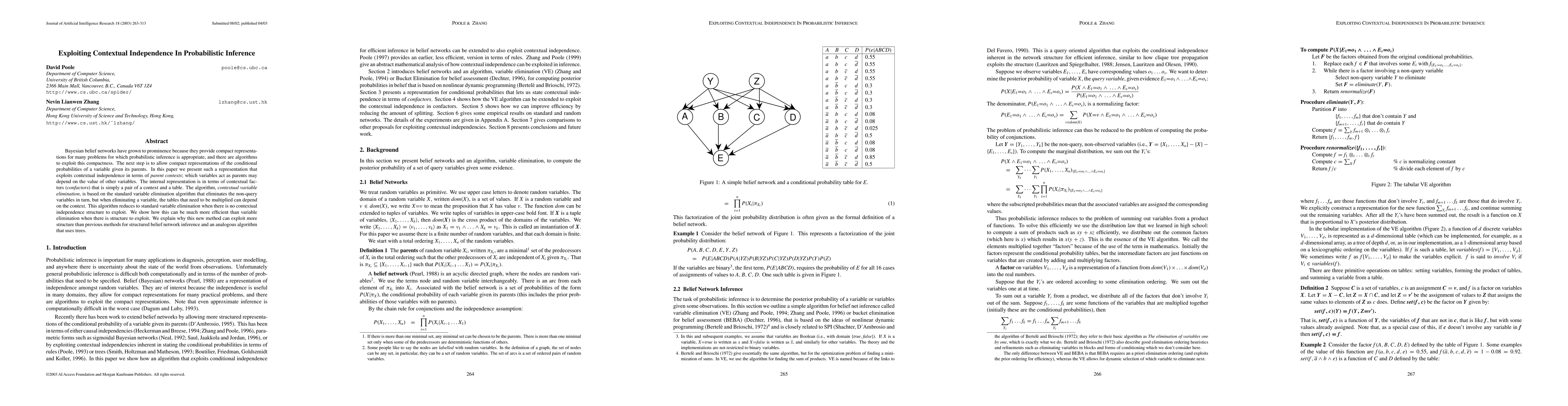 This paper introduces a new representation for Bayesian belief networks that exploits contextual independence, using confactors to represent conditional probabilities. The proposed contextual variable elimination algorithm enhances efficiency by leveraging contextual factors, significantly outperforming standard variable elimination in structured belief networks.