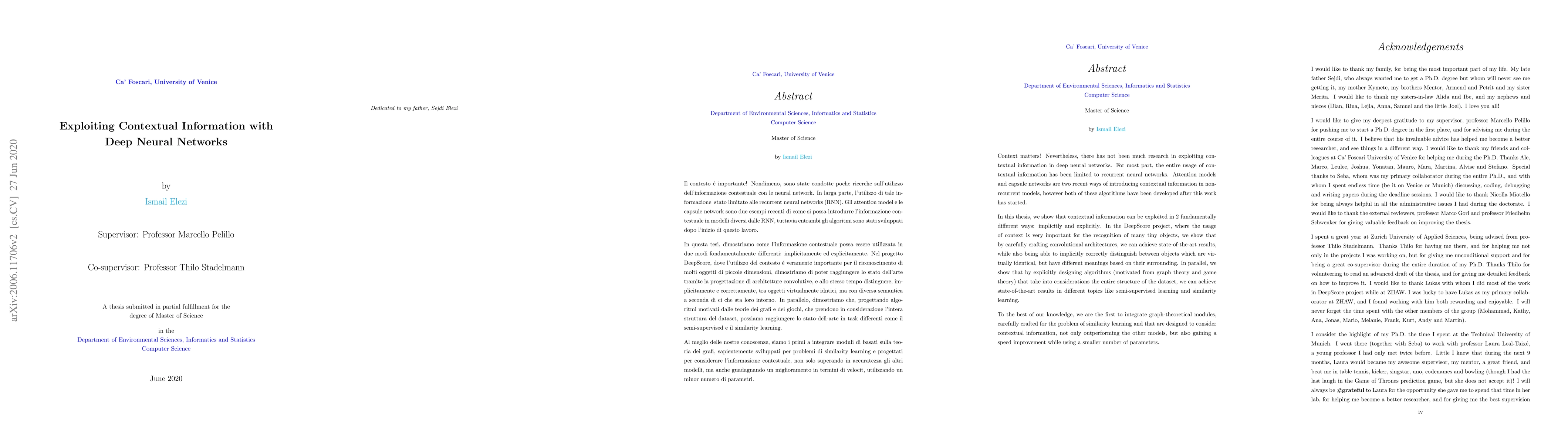 Context matters! Nevertheless, there has not been much research in exploiting contextual information in deep neural networks. For most part, the entire usage of contextual information has been limited to recurrent neural networks. Attention models and capsule networks are two recent ways of introducing contextual information in non-recurrent models, however both of these algorithms have been developed after this work has started. In this thesis, we show that contextual information can be exploited in 2 fundamentally different ways: implicitly and explicitly. In the DeepScore project, where the usage of context is very important for the recognition of many tiny objects, we show that by carefully crafting convolutional architectures, we can achieve state-of-the-art results, while also being able to implicitly correctly distinguish between objects which are virtually identical, but have different meanings based on their surrounding. In parallel, we show that by explicitly designing algorithms (motivated from graph theory and game theory) that take into considerations the entire structure of the dataset, we can achieve state-of-the-art results in different topics like semi-supervised learning and similarity learning. To the best of our knowledge, we are the first to integrate graph-theoretical modules, carefully crafted for the problem of similarity learning and that are designed to consider contextual information, not only outperforming the other models, but also gaining a speed improvement while using a smaller number of parameters.
