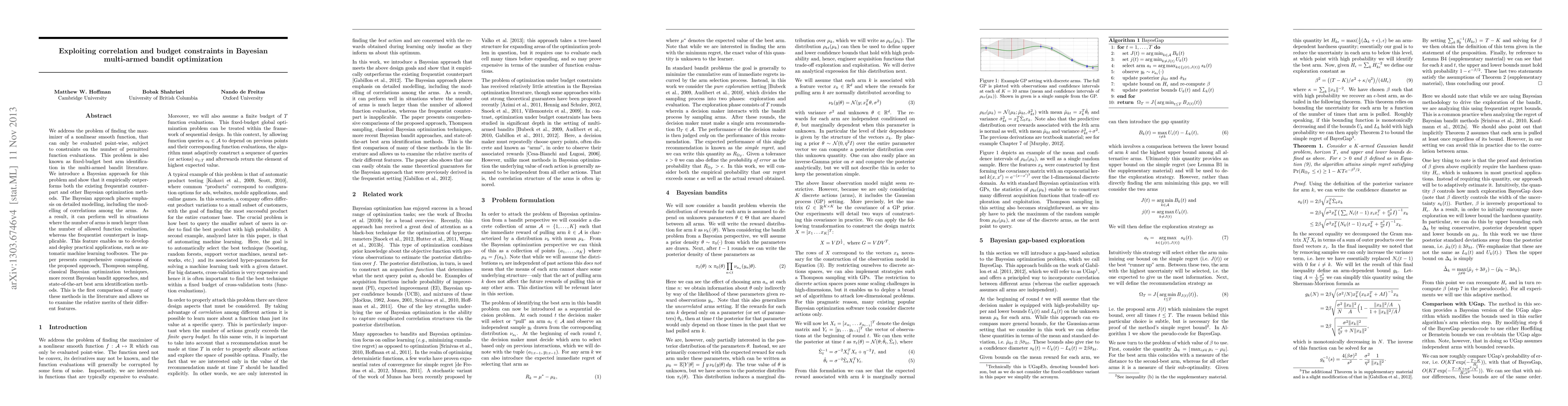 We address the problem of finding the maximizer of a nonlinear smooth function, that can only be evaluated point-wise, subject to constraints on the number of permitted function evaluations. This problem is also known as fixed-budget best arm identification in the multi-armed bandit literature. We introduce a Bayesian approach for this problem and show that it empirically outperforms both the existing frequentist counterpart and other Bayesian optimization methods. The Bayesian approach places emphasis on detailed modelling, including the modelling of correlations among the arms. As a result, it can perform well in situations where the number of arms is much larger than the number of allowed function evaluation, whereas the frequentist counterpart is inapplicable. This feature enables us to develop and deploy practical applications, such as automatic machine learning toolboxes. The paper presents comprehensive comparisons of the proposed approach, Thompson sampling, classical Bayesian optimization techniques, more recent Bayesian bandit approaches, and state-of-the-art best arm identification methods. This is the first comparison of many of these methods in the literature and allows us to examine the relative merits of their different features.