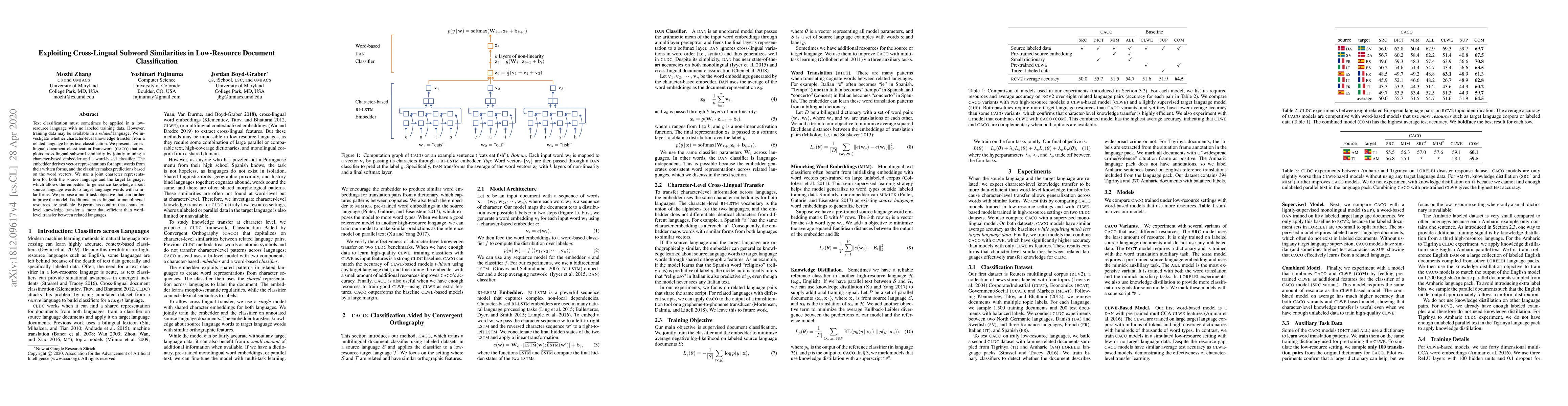 This paper proposes a cross-lingual document classification framework (CACO) that leverages character-level knowledge transfer from a related language to improve text classification in low-resource settings. The framework jointly trains a character-based embedder and a word-based classifier, demonstrating that character-level knowledge transfer is more data-efficient than word-level transfer.