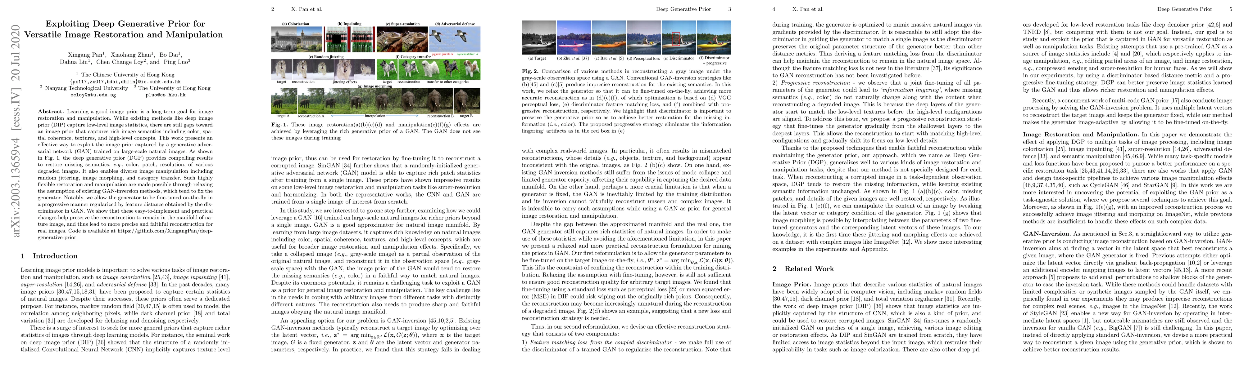 This paper proposes a deep generative prior (DGP) approach that leverages a generative adversarial network (GAN) to restore and manipulate images by capturing rich image semantics. The method fine-tunes the GAN generator progressively, leading to precise and faithful restoration of missing image details and enabling diverse manipulations.