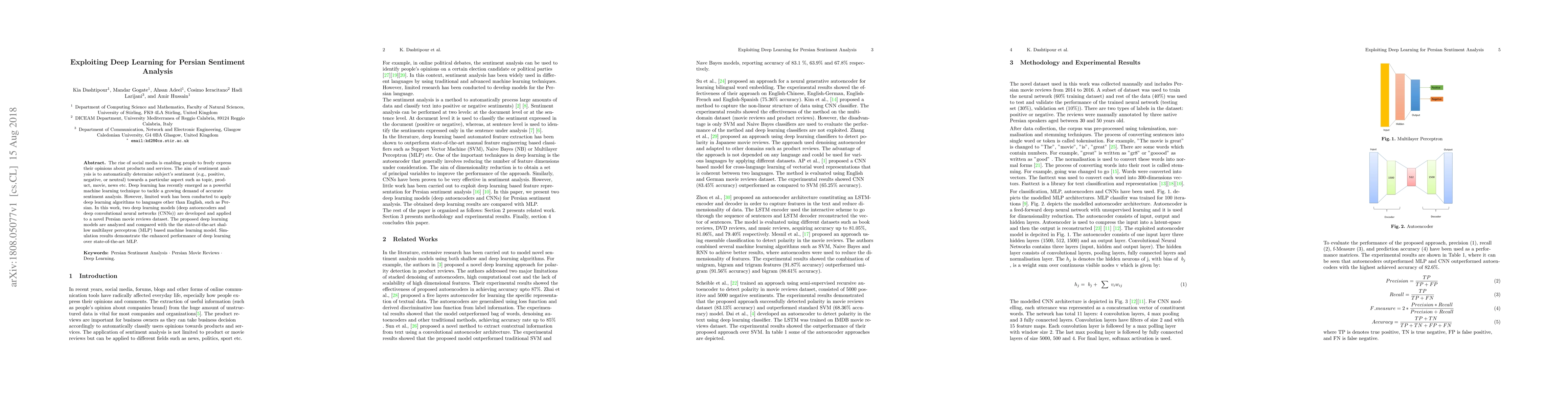 This paper develops deep learning models for Persian sentiment analysis using deep autoencoders and deep CNNs, applying them to a new Persian movie reviews dataset. The results show that these deep learning models outperform the state-of-the-art shallow multilayer perceptron (MLP) model.