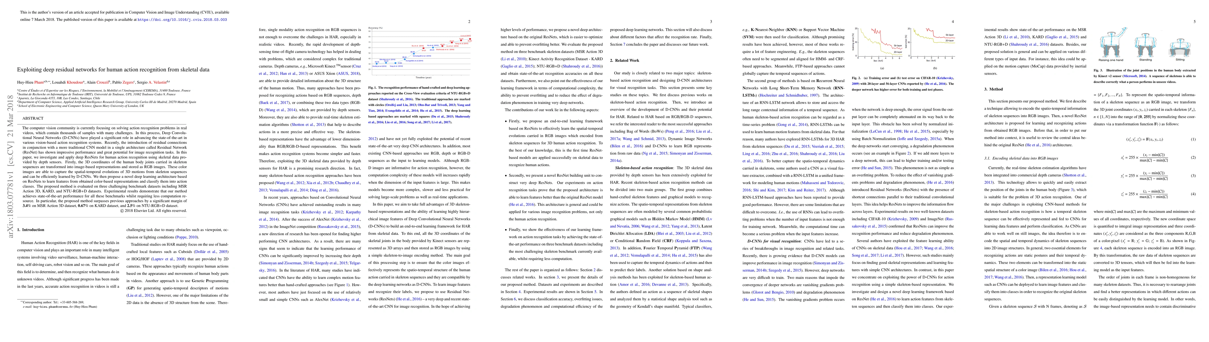 This paper explores the application of deep residual networks (ResNets) for human action recognition using skeletal data from depth sensors. It transforms 3D joint coordinates into RGB images and employs ResNets to extract features, achieving state-of-the-art results on multiple datasets with less computational cost.
