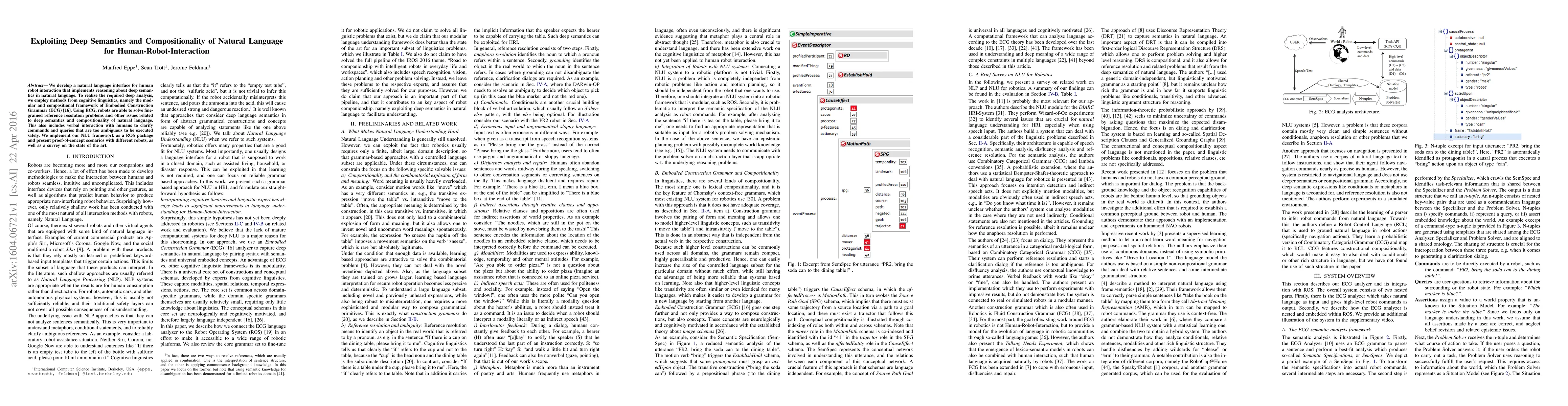 The paper proposes a natural language interface for human-robot interaction leveraging deep semantics and compositionality through Embodied Construction Grammar. It demonstrates fine-grained reference resolution and interactive clarification capabilities, implemented as a ROS package with practical scenarios.
