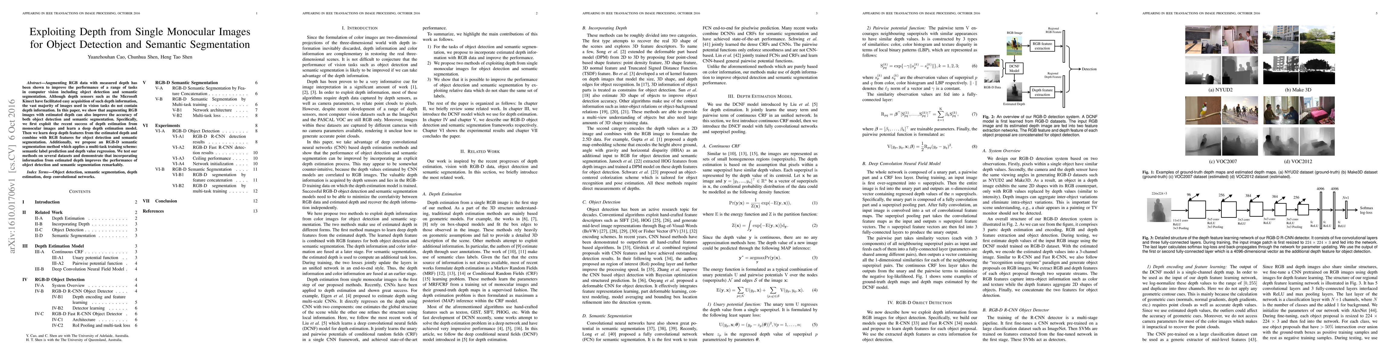 This paper explores enhancing object detection and semantic segmentation by augmenting RGB images with estimated depth from monocular images. It demonstrates that incorporating depth features, derived from a deep depth estimation model, significantly improves both tasks' accuracy.
