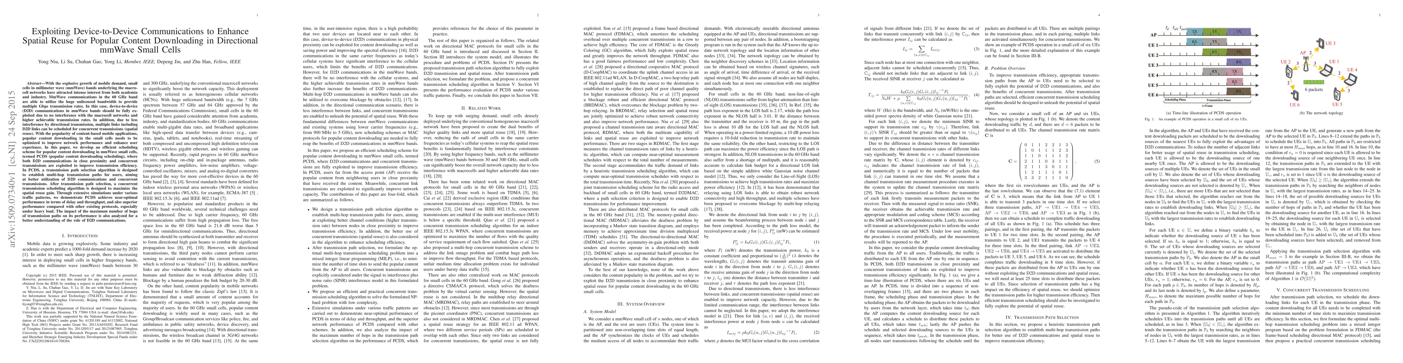 This paper proposes a scheduling scheme, PCDS, to enhance spatial reuse for popular content downloading in mmWave small cells using device-to-device communications. The scheme optimizes transmission efficiency through multi-hop paths and concurrent transmissions, achieving near-optimal delay and throughput performance, especially under heavy load conditions.