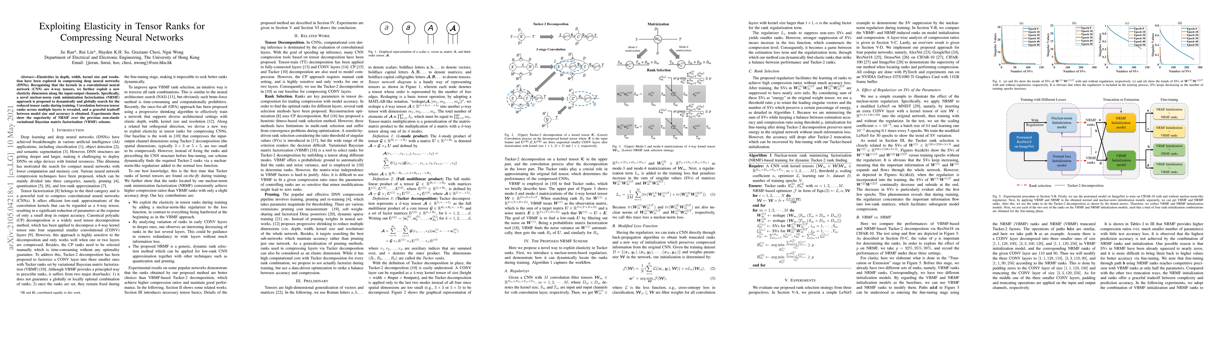 Elasticities in depth, width, kernel size and resolution have been explored in compressing deep neural networks (DNNs). Recognizing that the kernels in a convolutional neural network (CNN) are 4-way tensors, we further exploit a new elasticity dimension along the input-output channels. Specifically, a novel nuclear-norm rank minimization factorization (NRMF) approach is proposed to dynamically and globally search for the reduced tensor ranks during training. Correlation between tensor ranks across multiple layers is revealed, and a graceful tradeoff between model size and accuracy is obtained. Experiments then show the superiority of NRMF over the previous non-elastic variational Bayesian matrix factorization (VBMF) scheme.